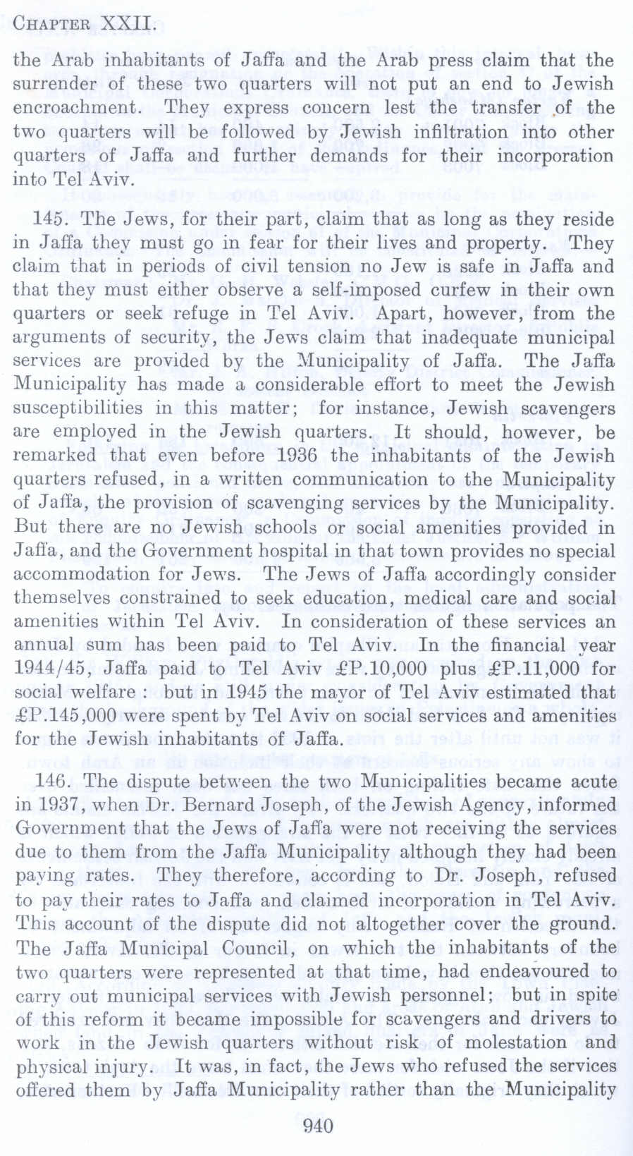 146. 'The dispute between the two Municipalities became acute in 1037, when Dr. Bernard Joseph, of the Jewish Agency, informed Government that the Jews of Jaffa were not receiving the services due to them from the Jaffa Municipality although they had been paying rates. They therefore, according to Dr. Joseph, refused to pay their rates to Jaffa and claimed incorporation in Tel Aviv. This account of the dispute did not altogether cover the ground. The Jaffa Municipal Council, on which the inhabitants of the two quarters were represented at that time, had endeavoured to carry out municipal services with Jewish personnel; but in spite of this reform it became impossible for scavengers and drivers to work in the Jewish quarters without risk of molestation and physical injury. It was, in fact, the Jews who refused the services offered them by Jaffa Municipality rather than the Municipality