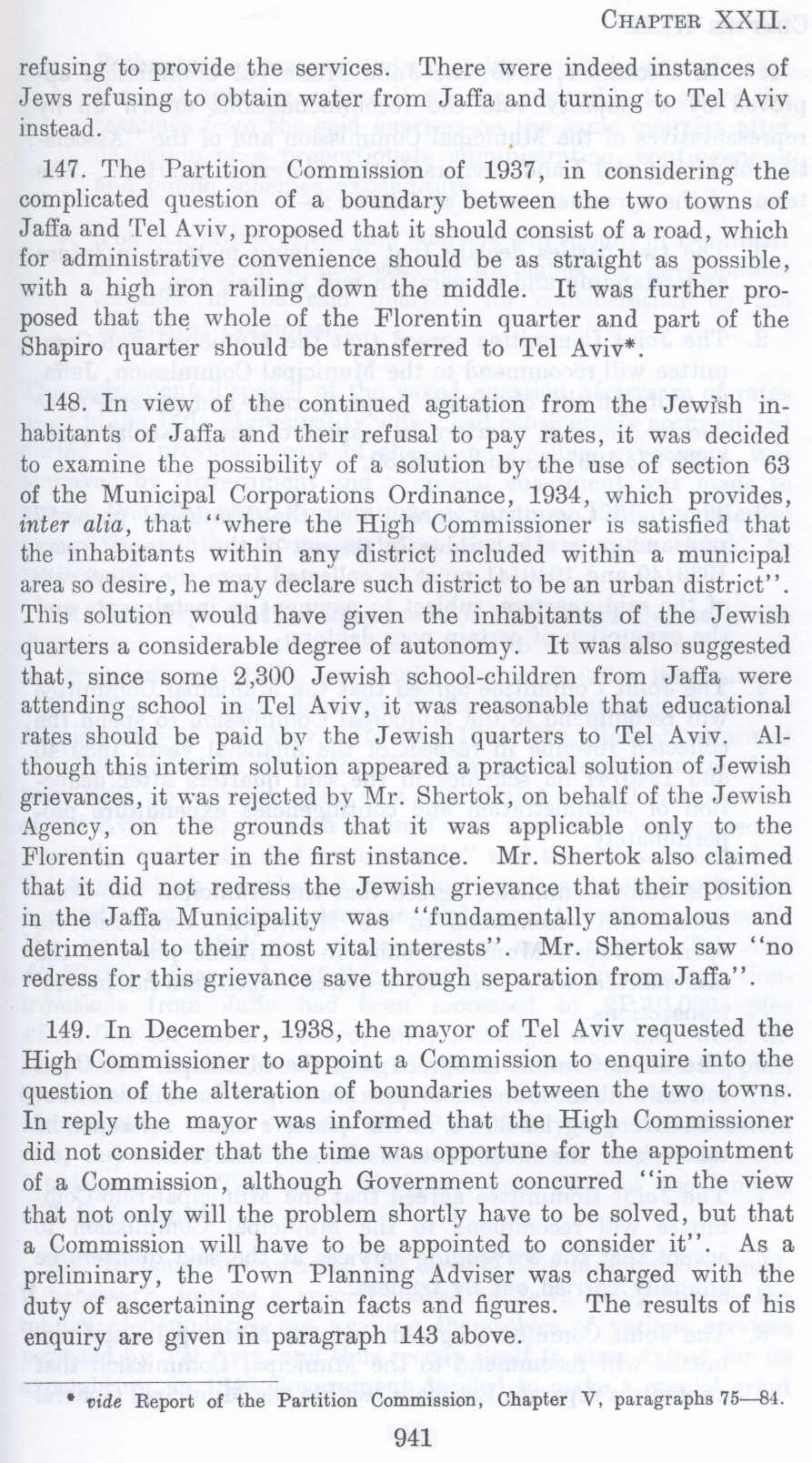 147. '!'he Partition Commission of 1937, in considering the complicated question of a boundary between the two towns of Jaffa and Tel Aviv, proposed that it should consist of a road, which for administrative convenience should be as straight as possible, with a high iron railing down the middle. It was further proposed that the whole of the Florentin quarter and part of the Shapiro quarter should he transferred to Tel Aviv*.