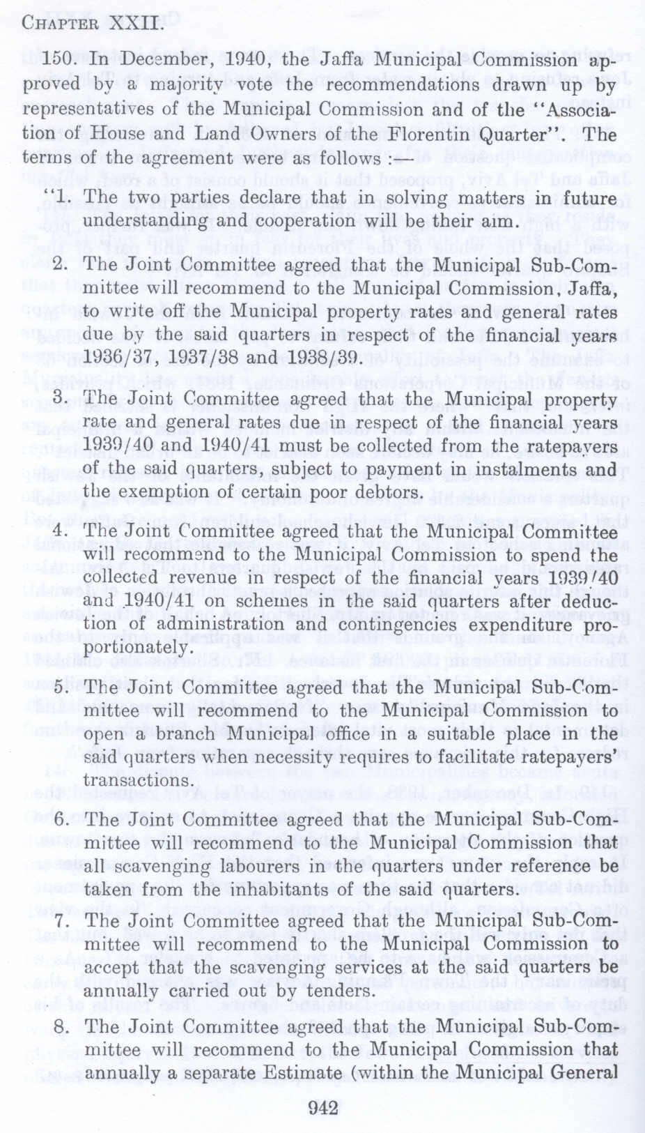 150. In December, 1940, the Jaffa Municipal Commission approved by a majority vote the recommendations drawn up by representatives of the Municipal Commission and of the "Association of House and Land Owners of the Florentin Quarter". The terms of the agreement were as follows :-