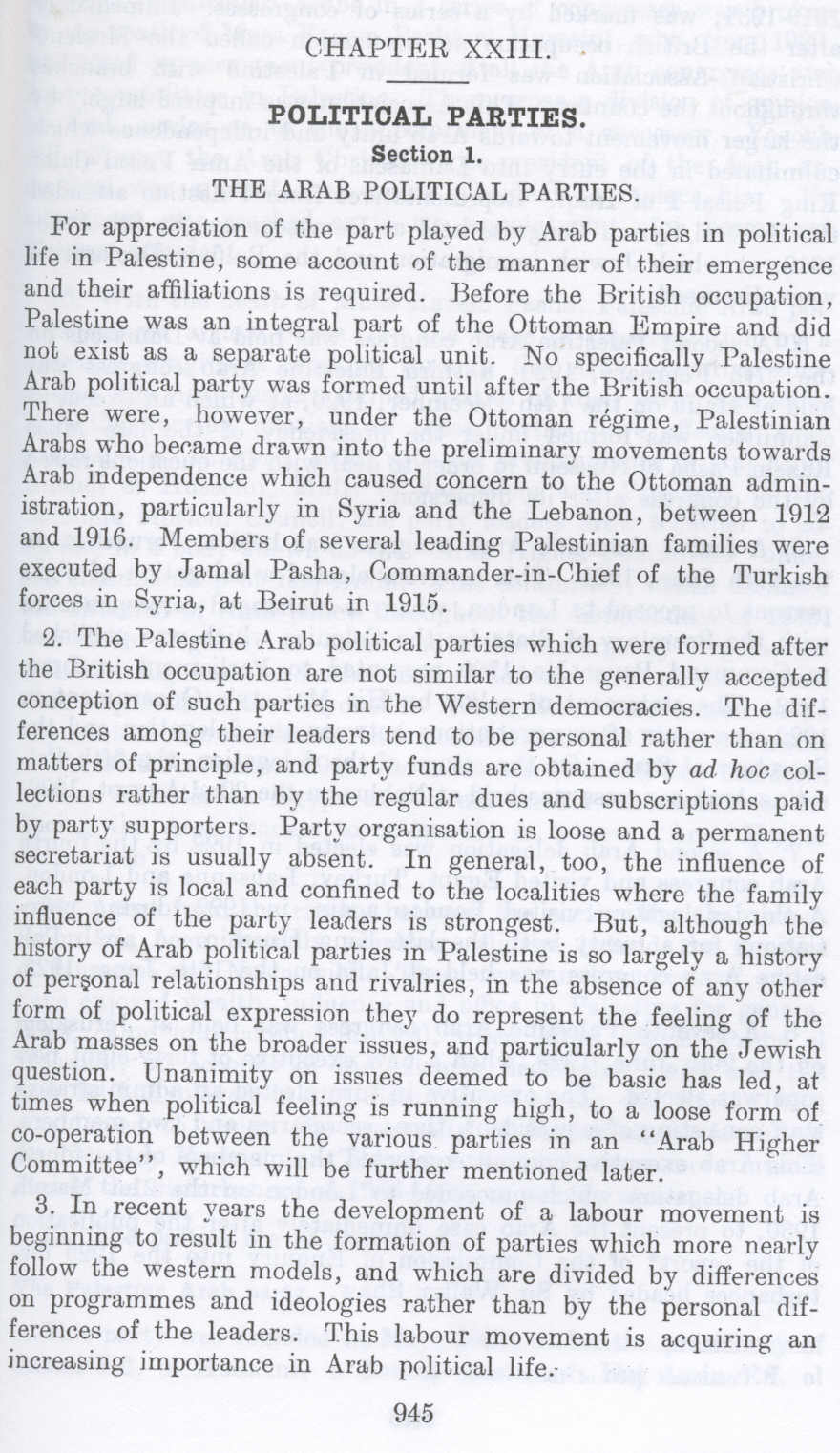 Political Parties in Palestine before 1948 (Nakba), Section 1: The Arab Political Parties. British Mandate: A Survey of Palestine: Volume II - Page 945. Chapter XXIII |