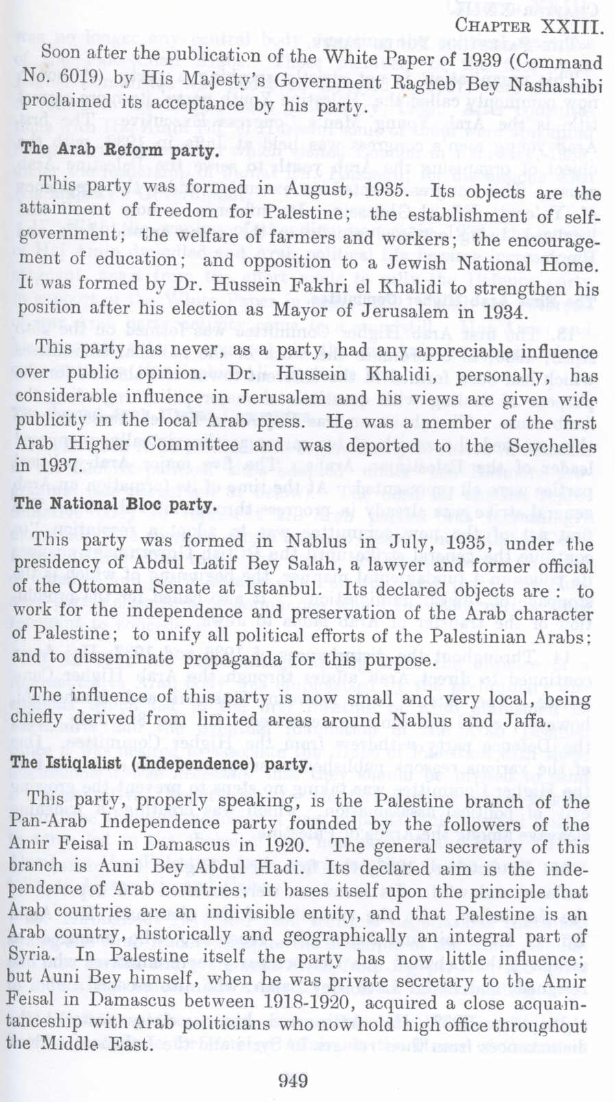 This party, properly speaking, is the Palestine branch of the Pan-Arab Independence party founded by the followers of the Amir Feisal in Damascus in 1920. The general secretary of this branch is Anni Bey Abdul Hadi. Its declared aim is the independence of Arab countries; it bases itself upon the principle that Arab countries are an indivisible entity, and that Palestine is an Arab country, historically and geographically an integral part of Syria. In Palestine itself the party has now little influence; but A uni Bey himself, when he was private secretary to the Amir Feisal in Damascus between 1918-1920, acquired a close acquaintanceship with Arab politicians who now hold high office throughout the Middle East.