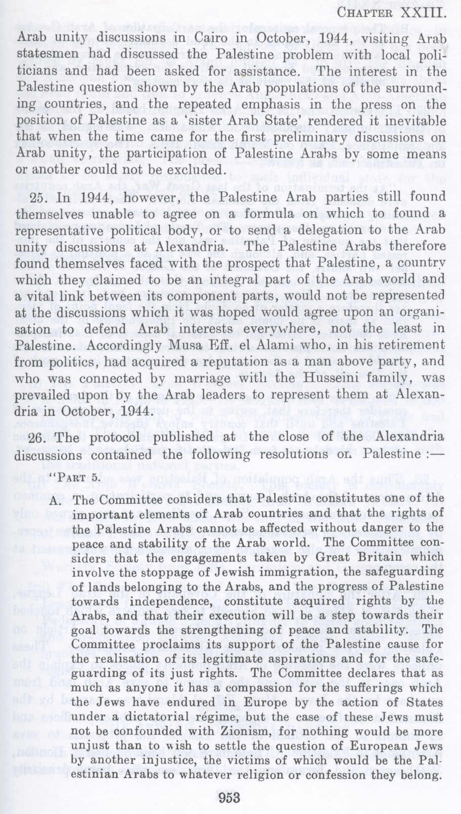 A. The Committee considers that Palestine constitutes one of the important elements of Arab countries and that the rights of the Palestine Arabs cannot be affected without danger to the peace and stability of the Arab world. The Committee considers that the engagements taken by Great Britain which involve the stoppage of Jewish immigration, the safeguarding of lands belonging to the Arabs, and the progress of Palestine towards independence, constitute acquired rights by the Arabs, and that their execution will be a step towards their goal towards the strengthening of peace and stability. The Committee proclaims its support of the Palestine cause for the realisation of its legitimate aspirations and for the safeguarding of its just rights. The Committee declares that as much as anyone it has a compassion for the sufferings which the Jews have endured in Europe by the action of States under a dictatorial regime, but the case of these Jews must not be confounded with Zionism, for nothing would be more unjust than to wish to settle the question of European Jews Ly another injustice, the victims of which would be the Palestinian Arabs to whatever religion or confession they belong.
