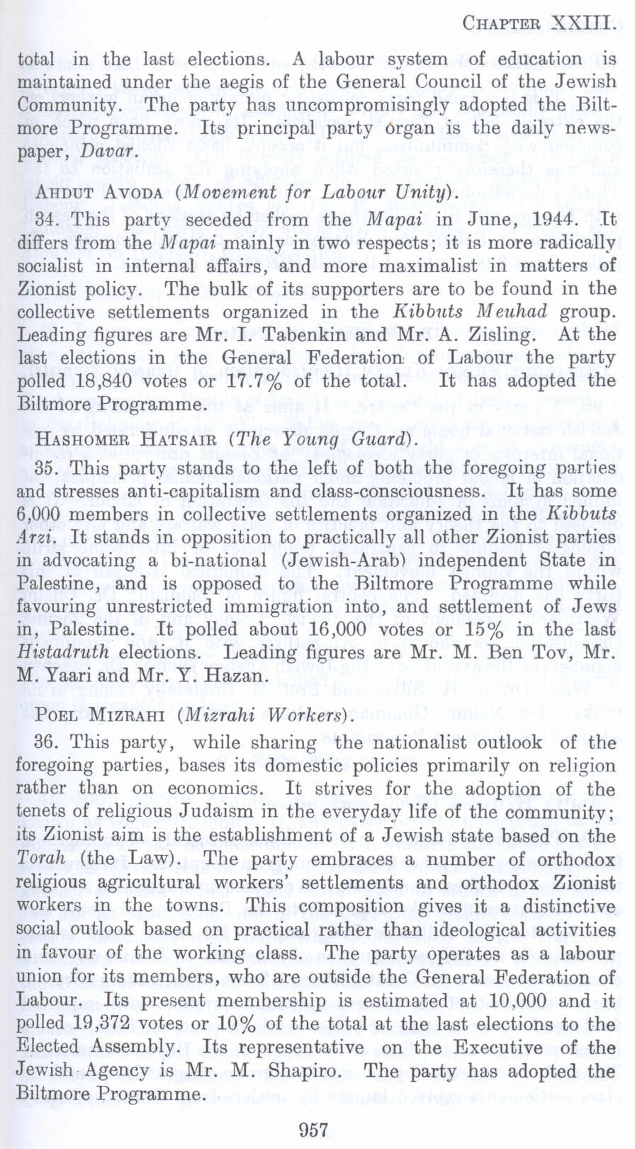 34. This party seceded from the Mapai in June, 1944. It differs from the Mapai mainly in two respects; it is more radically socialist in internal affairs, and more maximalist in matters of Zionist policy. The bulk of its supporters are to be found in the collective settlements organized in the Kibbnts M euluul group. Leading figures are Mr. I. Tabenkin and Mr. A. Zisling. At the last elections in the General Federation of Labour the party polled 18 ,840 votes or 17. 7 % of the total. It has adopted the Biltmore Programme.