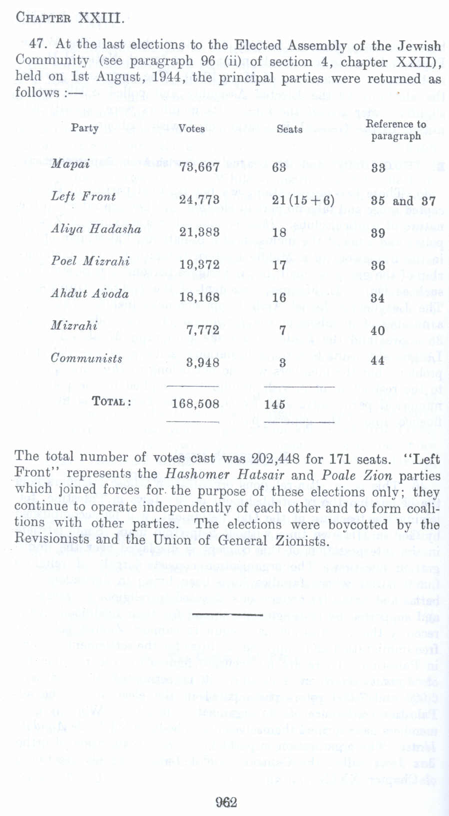 47. At the last elections to the Elected Assembly of the Jewish Community (see paragraph 96 (ii) of section 4, chapter XXII), held on 1st August, 1944, the principal parties were returned as follows:-