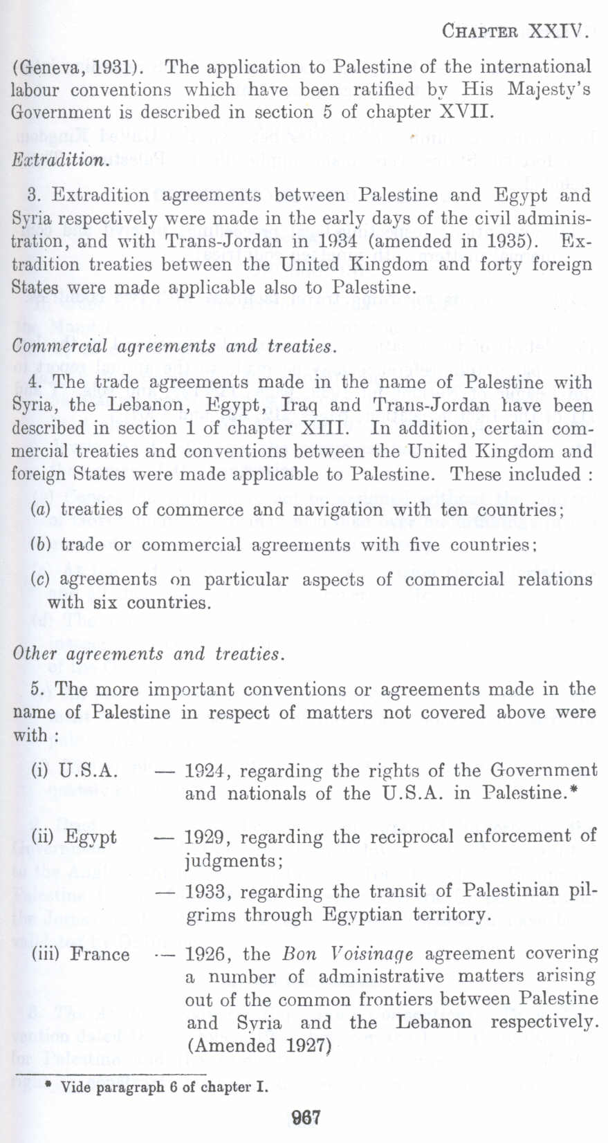 4. The trade agreements made in the name of Palestine with Syria, the Lebanon, Egypt, Iraq and Trans-Jordan have been described in section 1 of chapter XIII. In addition, certain commercial treaties and conventions between the United Kingdom and foreign States were made applicable to Palestine. These included :