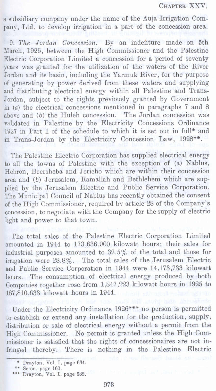 9. The Jordan Concession. By an indenture made on 5th March, 1926, between the High Commissioner and the Palestine Electric Corporation Limited a concession for a period of seventy years was granted for the utilization of the waters of the River Jordan and its basin, including the Yarmuk River, for the purpose of generating by power derived from these waters and supplying and distributing electrical energy within all Palestine and TransJordan, subject to the rights previously granted by Government in (a) the electrical concessions mentioned in paragraphs 7 and 8 above and (b) the Huleh concession. The Jordan concession was validated in Palestine by the Electricity Concessions Ordinance 1927 in Part I of the schedule to which it is set out in full* and in Trans-Jordan by the Electricity Concession Law, 1928**.