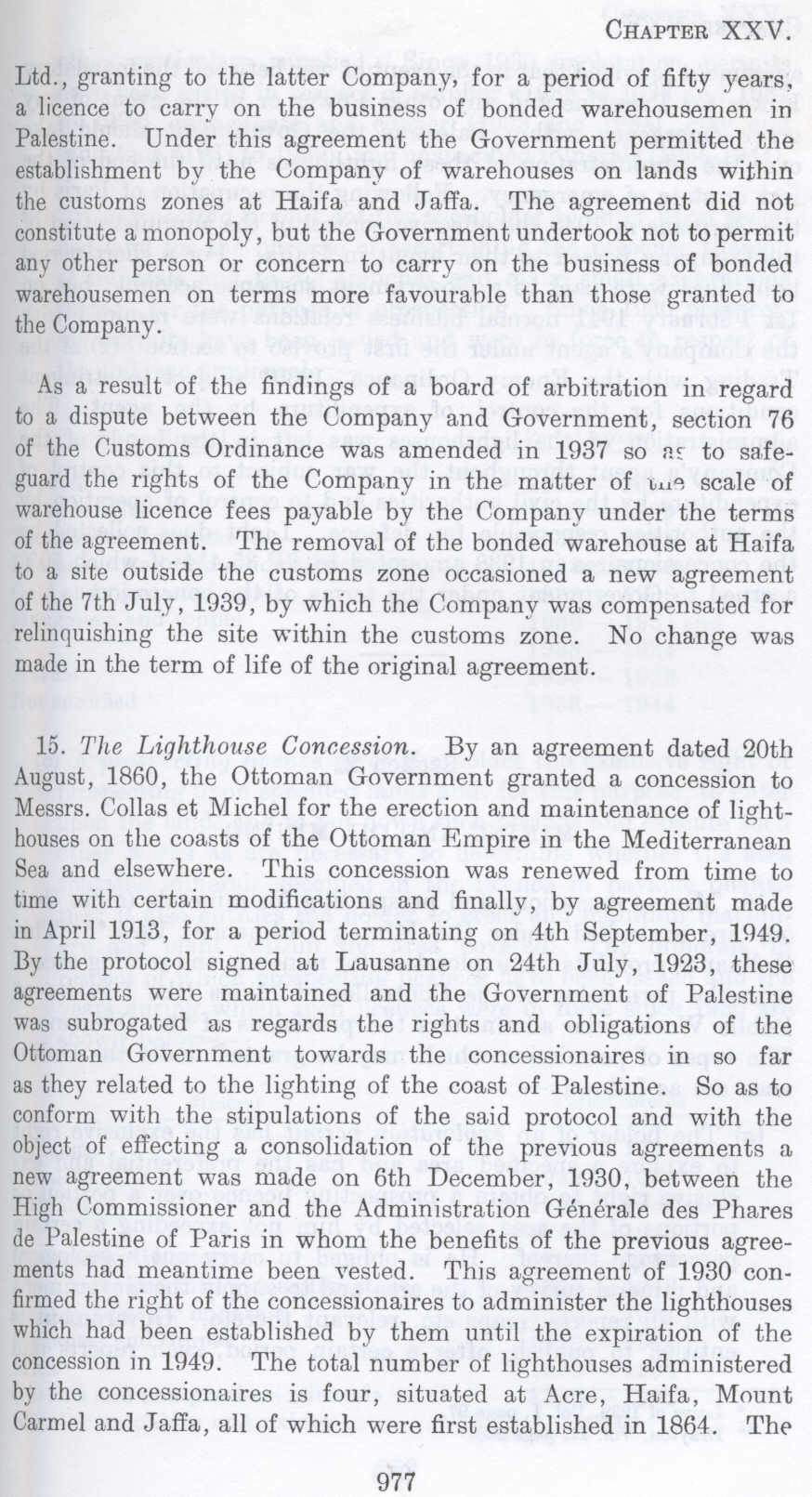 15. The Lighthouse Concession. By an agreement dated 20th August, 1860, the Ottoman Government granted a concession to Messrs. Collas et Michel for the erection and maintenance of lighthouses on the coasts of the Ottoman Empire in the Mediterranean Sea and elsewhere. This concession was renewed from time to time with certain modifications and finally, by agreement made in April 1913, for a period terminating on 4th September, 1949. By the protocol signed at Lausanne on 24th July, 1923, these agreements were maintained and the Government of Palestine was subrogated as regards the rights and obligations of the Ottoman Government towards the concessionaires in so far as they related to the lighting of the coast of Palestine. So as to conform with the stipulations of the said protocol and with the object of effecting a consolidation of the previous agreements a new agreement was made on 6th December, 1930, between the High Commissioner and the Administration Generals des Phares de Palestine of Paris in whom the benefits of the previous agreements had meantime been vested. This agreement of 1930 confirmed the right of the concessionaires to administer the lighthouses which had been established by them until the expiration of the concession in 1949. The total number of lighthouses administered by the concessionaires is four, situated at Acre, Haifa, Mount Carmel and Jaffa, all of which were first established in 1864. The