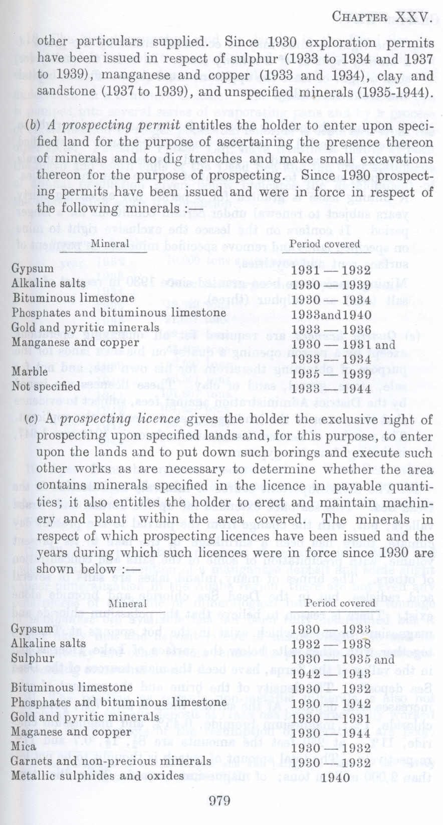 other particulars supplied. Since 1930 exploration permits have been issued in respect of sulphur (1933 to 1934 and 1937 to 1939), manganese and copper (1933 and 1934), clay and sandstone (1937 to 1939), and unspecified minerals (1935-1944).