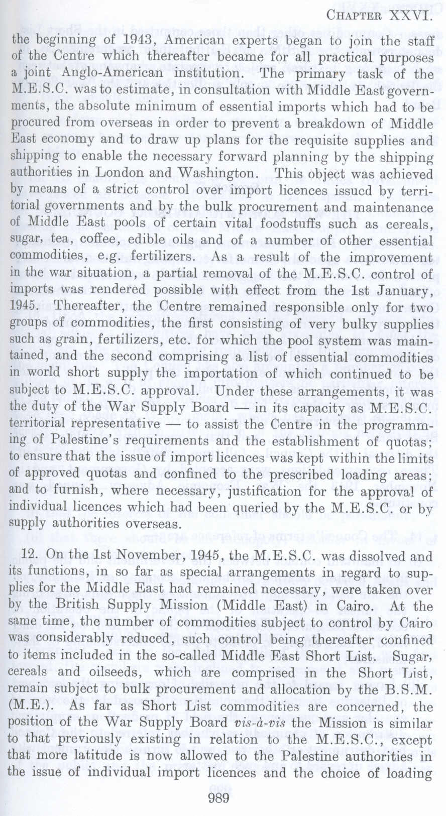 12. On the 1st November, 1945, the M.E.S.C. was dissolved and its functions, in so far as special arrangements in regard to supplies for the Middle East had remained necessary, were taken over by the British Supply Mission (Middle East) in Cairo. At the same time, the number of commodities subject to control by Cairo was considerably reduced, such control being thereafter confined to items included in the so-called Middle East Short List. Sugar, cereals and oilseeds, which are comprised in the Short List , remain subject to bulk procurement and allocation by the B.S.M. (M.E.). As far as Short List commodities are concerned, the position of the War Supply Board vis-a-vis the Mission is similar to that previously existing in relation to the M.E.S.C., except that more latitude is now allowed to the Palestine authorities in the issue of individual import licences and the choice of loading
