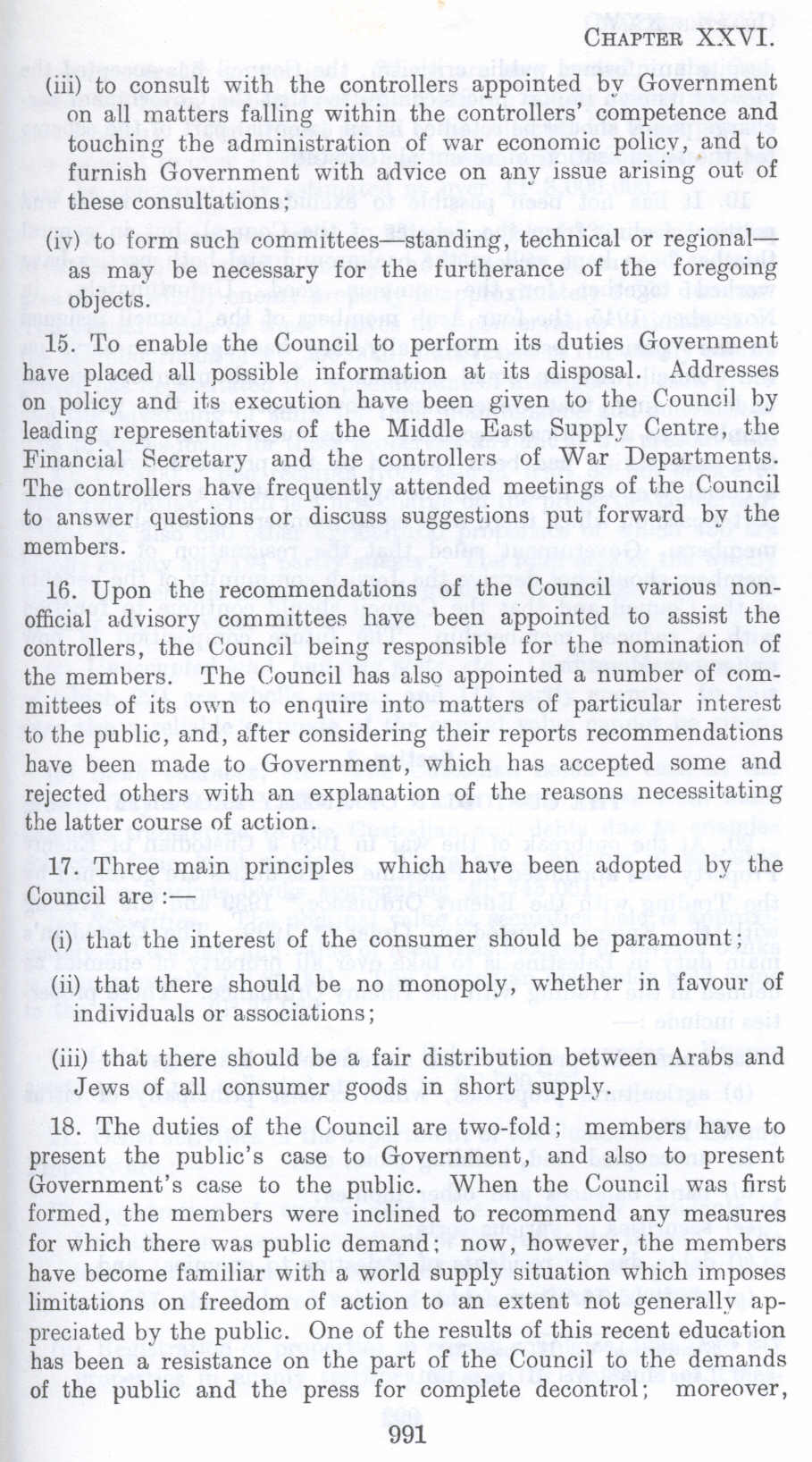15. To enable the Council to perform its duties Government have placed all possible information at its disposal. Addresses on policy and its execution have been given to the Council by leading representatives of the Middle East Supply Centre, the Financial Secretary and the controllers of War Departments. The controllers have frequently attended meetings of the Council to answer questions or discuss suggestions put forward by the members.