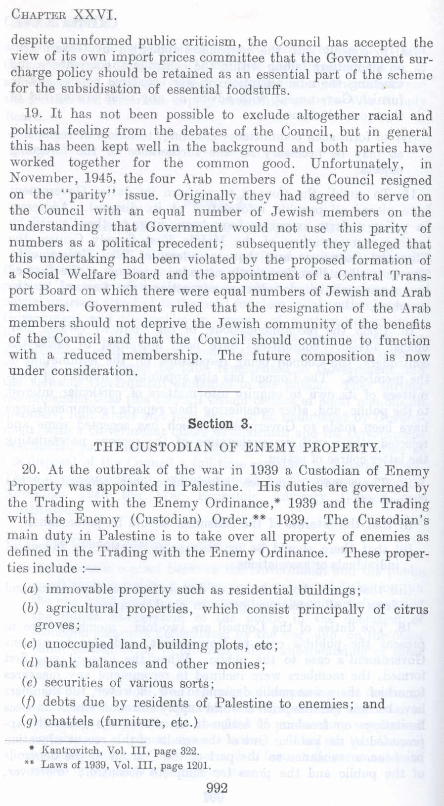 The Custodian of Enemy Property in Palestine before 1948 (Nakba),British Mandate: A Survey of Palestine: Volume II - Page 992. Chapter XXVI: War Economic Measures |