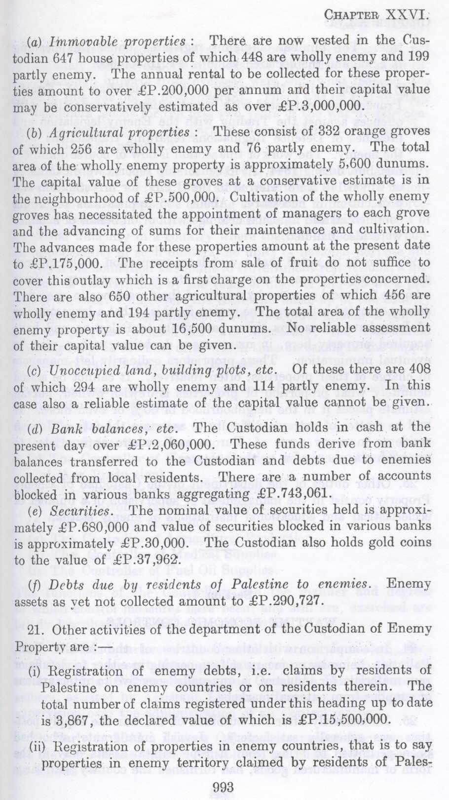 (b) Agricultural properties: These consist of 332 orange groves of which 256 are wholly enemy and 76 partly enemy. The total area of the wholly enemy property is approximately 5,600 dunums. The capital value of these groves at a conservative estimate is in the neighbourhood of £P.500,000. Cultivation of the wholly enemy groves has necessitated the appointment of managers to each grove and the advancing of sums for their maintenance and cultivation. The advances made for these properties amount at the present date to £P.l 75,000. The receipts from sale of fruit do not suffice to cover this outlay which is a first charge on the properties concerned. There are also 650 other agricultural properties of which 456 are wholly enemy and 194 partly enemy. The total area of the wholly enemy property is about 16,500 dunums. No reliable assessment of their capital value can be given.