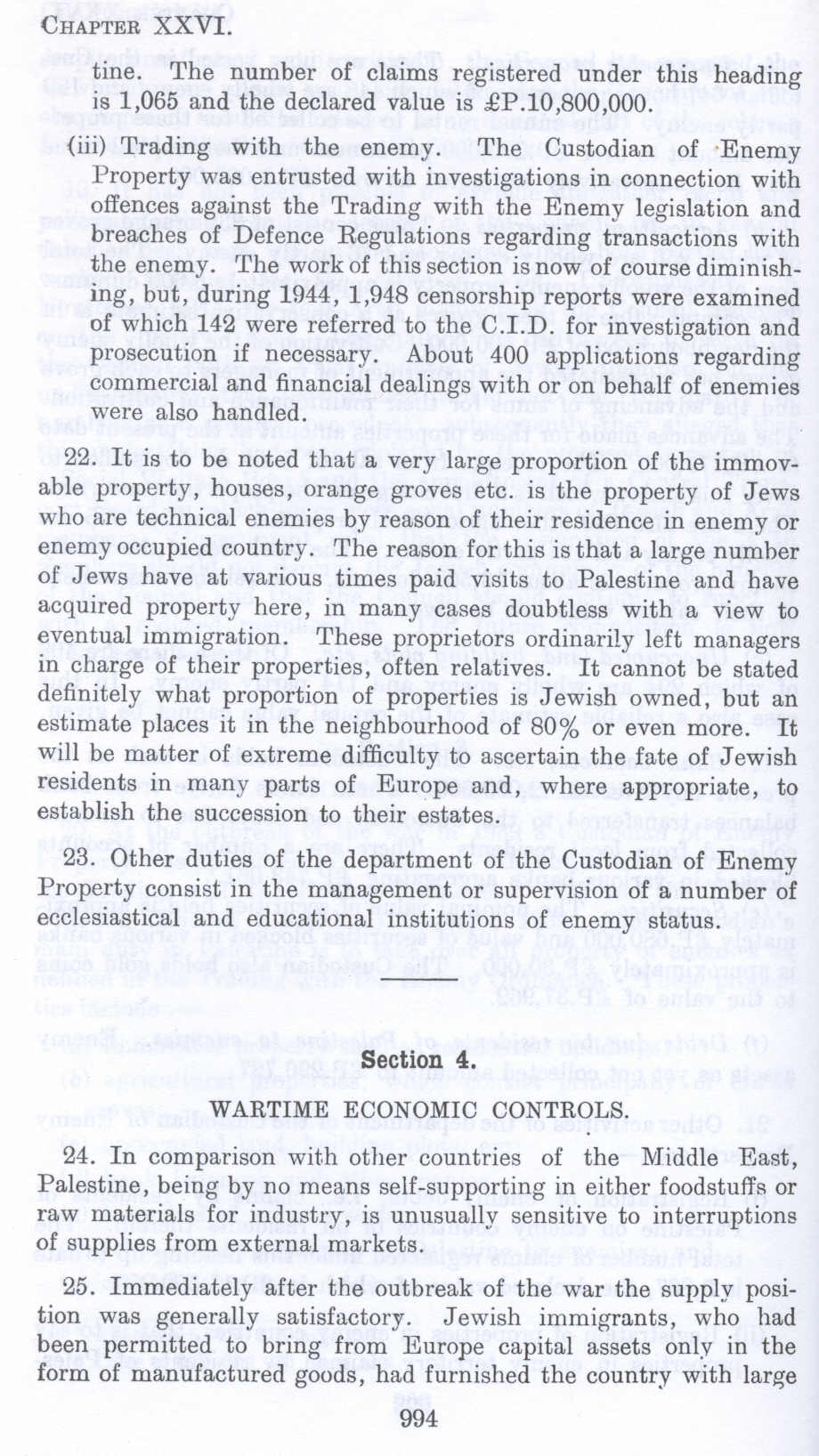 22. It is to be noted that a very large proportion of the immovable property, houses, orange groves etc. is the property of Jews who are technical enemies by reason of their residence in enemy or enemy occupied country. The reason for this is that a large number of Jews have at various times paid visits to Palestine and have acquired property here, in many cases doubtless with a view to eventual immigration. These proprietors ordinarily left managers in charge of their properties, often relatives. It cannot be stated definitely what proportion of properties is Jewish owned, but an estimate places it in the neighbourhood of 80% or even more. It will be matter of extreme difficulty to ascertain the fate of Jewish residents in many parts of Europe and, where appropriate, to establish the succession to their estates.