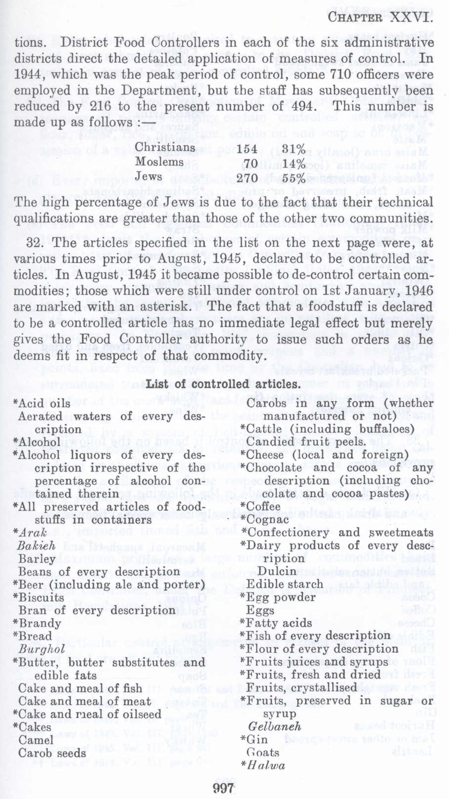 32. The articles specified in the list on the next page were, at various times prior to August, 1945, declared to be controlled articles. In August, 1945 it became possible to de-control certain commodities; those which were still under control on 1st January, 1946 are marked with an asterisk. The fact that a foodstuff is declared to be a controlled article has no immediate legal effect but merely gives the Food Controller authority to issue such orders as he deems fit in respect of that commodity.