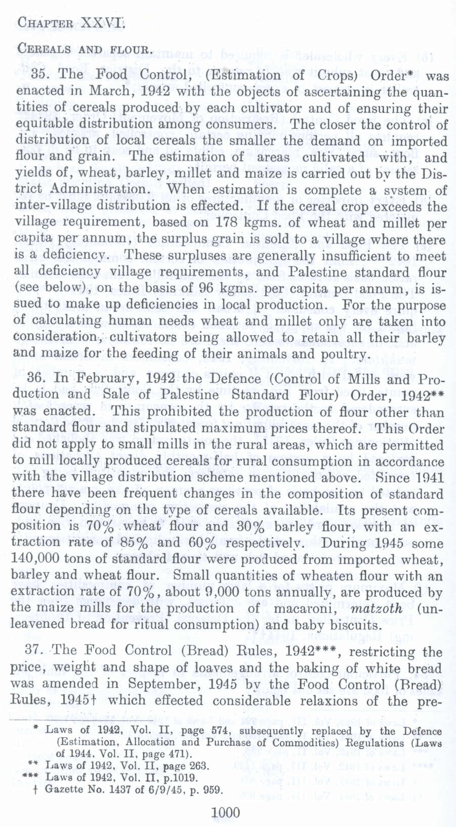 36. In February, 1942 the Defence (Control of Mills and Production and Sale of Palestine Standard Flour) Order, 1942 ** was enacted. This prohibited the production of flour other than standard flour and stipulated maximum prices thereof. This Order did not apply to small mills in the rural areas, which are permitted to mill locally produced cereals for rural consumption in accordance with the village distribution scheme mentioned above. Since 1941 there have been frequent changes in the composition of standard flour depending on the type of cereals available. Its present composition is 70% wheat flour and 30% barley flour, with an extraction rate of 85% and 60% respectively. During 1945 some 140,000 tons of standard flour were produced from imported wheat, barley and wheat flour. Small quantities of wheaten flour with an extraction rate of 70%, about 9,000 tons annually, are produced by the maize mills for the production of macaroni, matzoth (unleavened bread for ritual consumption) and baby biscuits.