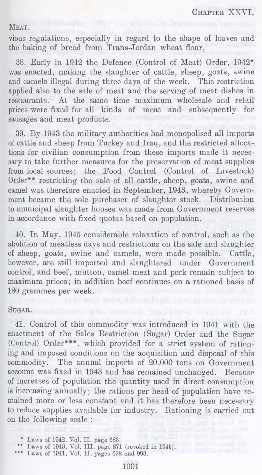 39. By 1943 the military authorities had monopolised all imports of cattle and sheep from Turkey and Iraq, and the restricted allocations for civilian consumption from these imports made it necessary to take further measures for the preservation of meat supplies from local sources; the Food Control (Control of Livestock) Order ** restricting the sale of all cattle, sheep, goats, swine and camel was therefore enacted in September, 1943, whereby Government became the sole purchaser of slaughter stock. Distribution to municipal slaughter houses was made from Government reserves in accordance with fixed quotas based on population.
