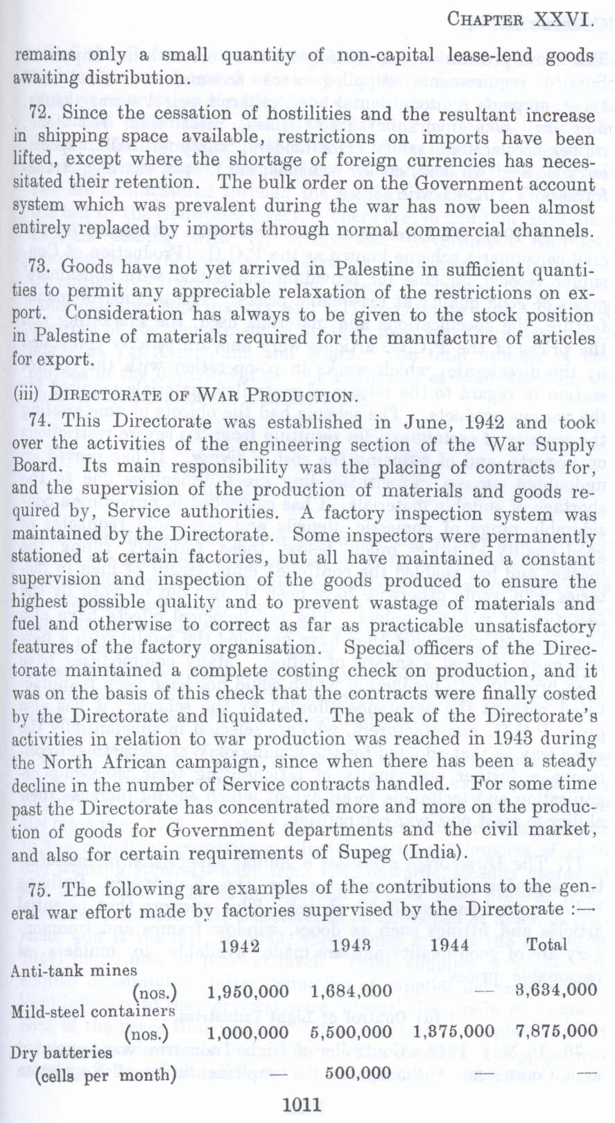 73. Goods have not yet arrived in Palestine in sufficient quantities to permit any appreciable relaxation of the restrictions on export. Consideration has always to be given to the stock position in Palestine of materials required for the manufacture of articles for export.
