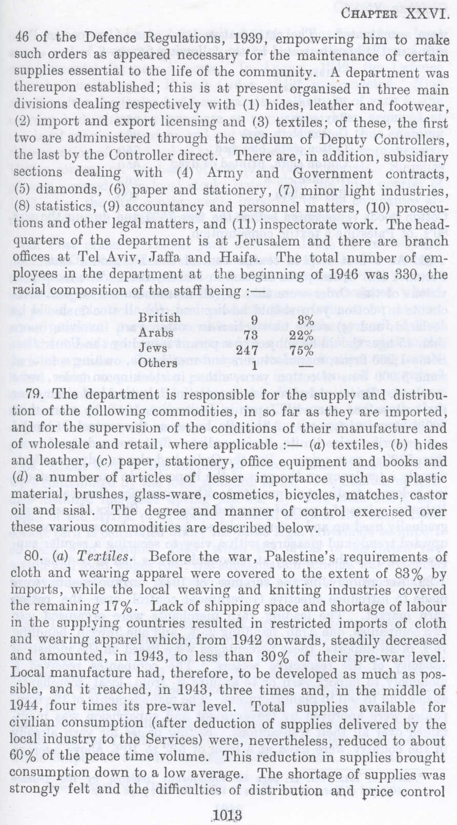 46 of the Defence Regulations, 1939, empowering him to make such orders as appeared necessary for the maintenance of certain supplies essential to the life of the community. A, department was thereupon established; this is at present organised in three main divisions dealing respectively with (1) hides, leather and footwear, (2) import and export licensing and (3) textiles; of these, the first two are administered through the medium of Deputy Controllers, the last by the Controller direct. There are, in addition, subsidiary sections dealing with (4.) Army and Government contracts, (5) diamonds, (6) paper and stationery, (7) minor light industries, (8) statistics, (9) accountancy and personnel matters, (10) prosecutions and other legal matters, and (11) inspectorate work. The headquarters of the department is at Jerusalem and there are branch offices at Tel Aviv, Jaffa and Haifa. The total number of employees in the department at the beginning of 194.6 was 330, the racial composition of the staff being :-