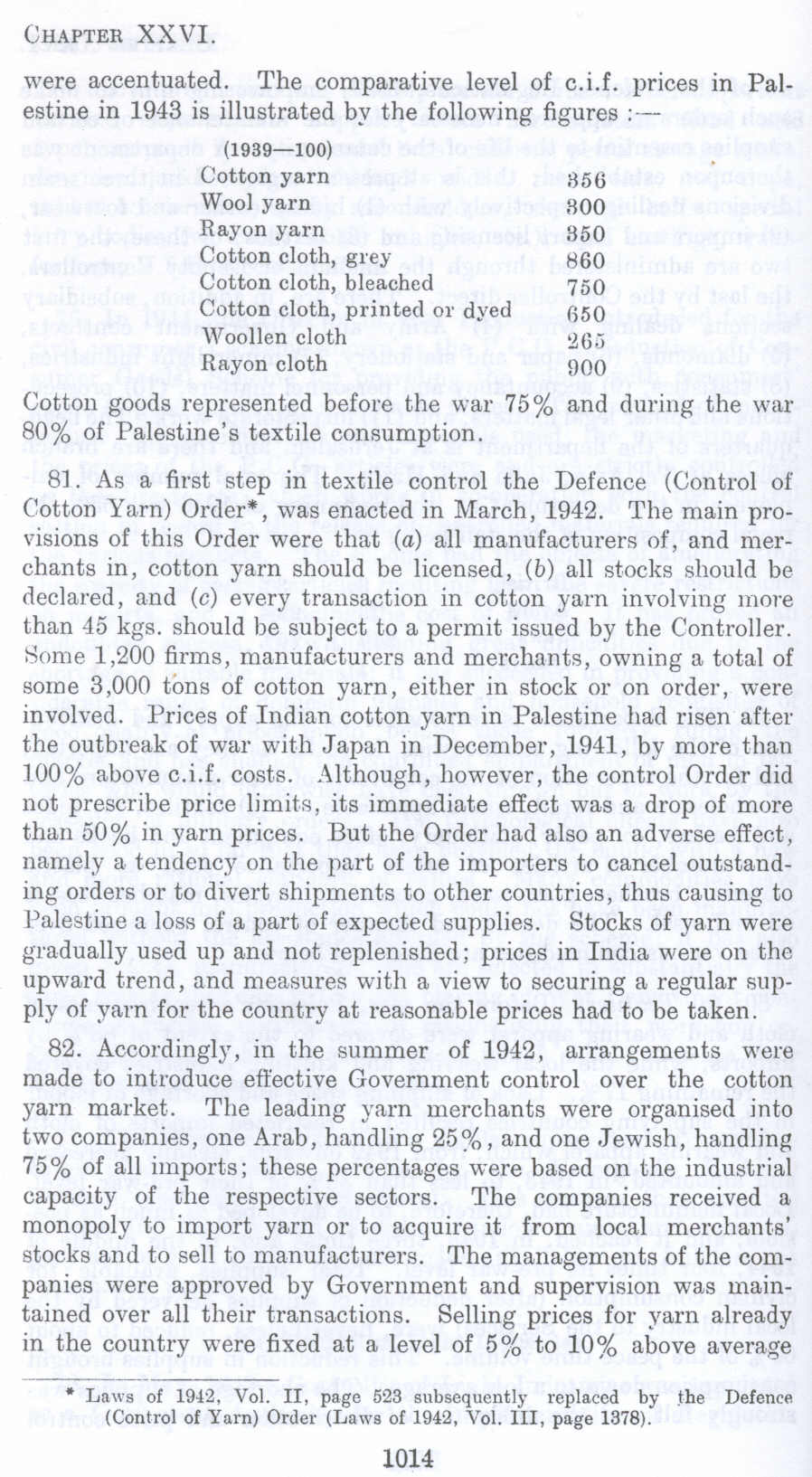 81. As a first step in textile control the Defence (Control of Cotton Yarn) Order:*, was enacted in March, 1942. The main provisions of this Order were that (a) all manufacturers of, and merchants in, cotton yarn should be licensed, (b) all stocks should be declared, and (c) every transaction in cotton yarn involving more than 45 kgs. should be subject to a permit issued by the Controller. Some 1,200 firms, manufacturers and merchants, owning a total of some 3,000 tons of cotton yarn, either in stock or on order, were involved. Prices of Indian cotton yarn in Palestine had risen after the outbreak of war with Japan in December, 1941, by more than 100% above c.i.f. costs. Although, however, the control Order did not prescribe price limits, its immediate effect was a drop of more than 50% in yarn prices. But the Order bad also an adverse effect, namely a tendency on the part of the importers to cancel outstanding orders or to divert shipments to other countries, thus causing to Palestine a loss of a part of expected supplies. Stocks of yarn were gradually used up and not replenished; prices in India were on the upward trend, and measures with a view to securing a regular supply of yarn for the country at reasonable prices had to be taken.