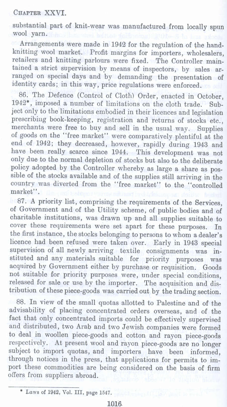 86. The Defence (Control of Cloth) Order, enacted in October, 1942*, imposed a number of limitations on the cloth trade. Subject only to the limitations embodied in their licences and legislation prescribing book-keeping, registration and returns of stocks etc., merchants were free to buy and sell in the usual way. Supplies of goods on the "free market" were comparatively plentiful at the end of 1942; they decreased, however, rapidly during 1943 and have been really scarce since 1944. This development was not only due to the normal depletion of stocks but also to the deliberate policy adopted by the Controller whereby as large a share as possible of the stocks available and of the supplies still arriving in the country was diverted from the "free market" to the "controlled market".
