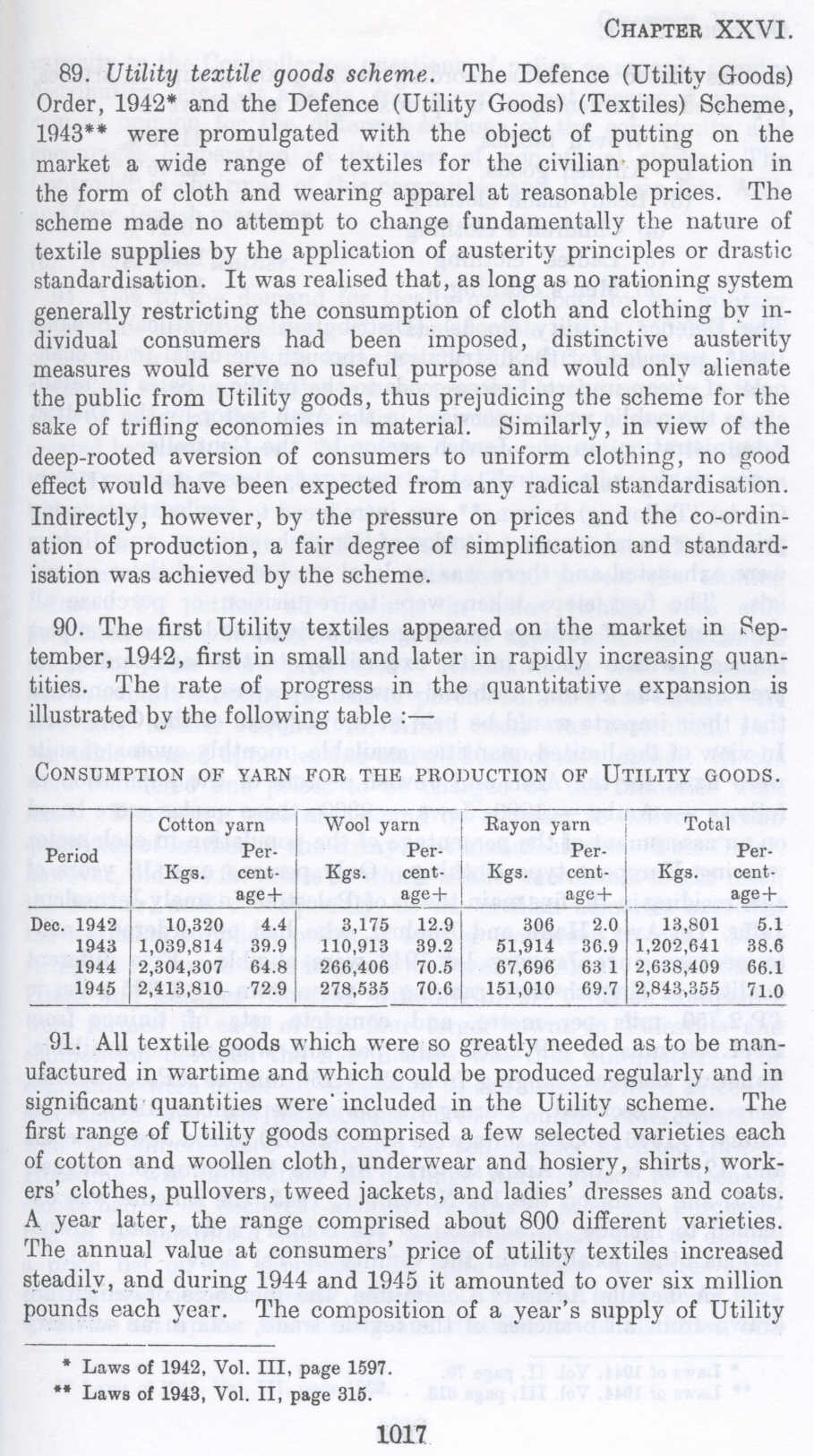 89. Utility textile goods scheme. The Defence (Utility Goods) Order, 1942* and the Defence (Utility Goods) (Textiles) Scheme, 1943.. were promulgated with the object of putting on the market a wide range of textiles for the civilian• population in the form of cloth and wearing apparel at reasonable prices. The scheme made no attempt to change fundamentally the nature of textile supplies by the application of austerity principles or drastic standardisation. It was realised that, as long as no rationing system generally restricting the consumption of cloth and clothing by individual consumers had been imposed, distinctive austerity measures would serve no useful purpose and would only alienate the public from Utility goods, thus prejudicing the scheme for the sake of trifling economies in material. Similarly, in view of the deep-rooted aversion of consumers to uniform clothing, no good effect would have been expected from any radical standardisation. Indirectly, however, by the pressure ou prices and the co-ordination of production, a fair degree of simplification and standardisation was achieved by the scheme.