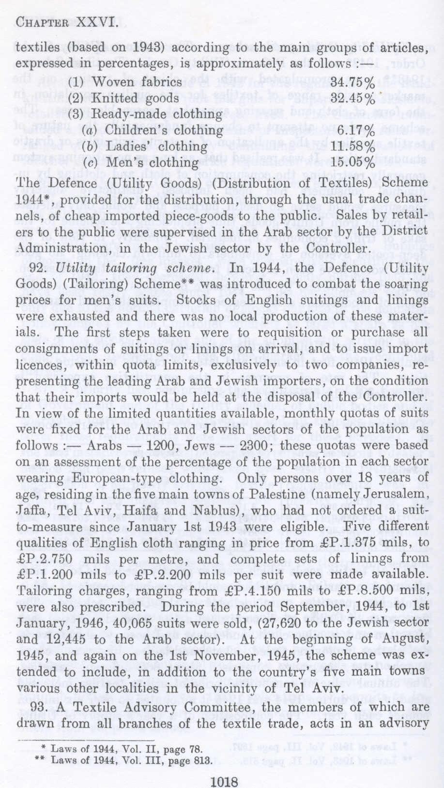 92. Utility tailoring scheme. In 1944, the Defence (Utility Goods) (Tailoring) Scheme** was introduced to combat the soaring prices for men's suits. Stocks of English suitings and linings were exhausted and there was no local production of these materials. The first steps taken were to requisition or purchase all consignments of suitings or linings on arrival, and to issue import licences, within quota limits, exclusively to two companies, representing the leading Arab and Jewish importers, on the condition that their imports would be held at the disposal of the Controller. In view of the limited quantities available, monthly quotas of suits were fixed for the Arab and Jewish sectors of the population as follows:- Arabs - 1200, Jews - 2300; these quotas were based on an assessment of the percentage of the population in each sector wearing European-type clothing. Only persons over 18 ye11rs of age, residing in the five main towns of Palestine (namely Jerusalem, Jaffa, Tel Aviv, Haifa and Nablus), who had not ordered a suit to-measure since January 1st 1943 were eligible. Five different qualities of English cloth ranging in price from £P.l.375 mils, to £P.2. 750 mils per metre, and complete sets of linings from £P.l.200 mils to £P.2.200 mils per suit were made available. Tailoring charges, ranging from £P.4.150 mils to £P.8.500 mils, were also prescribed. During the period September, 1944, to 1st January, 1946, 40,065 suits were sold, (27,620 to the Jewish sector and 12,445 to the Arab sector). At the beginning of August, 1945, and again on the 1st November, 1945, The scheme was extended to include, in addition to the country's five main towns various other localities in the vicinity of Tel Aviv.