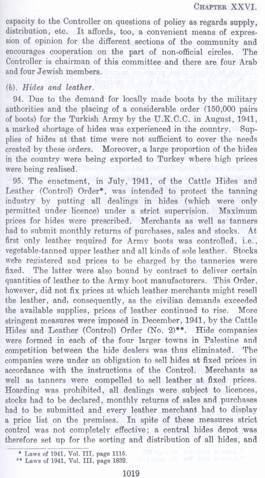 95. The enactment, in July, 1941, of the Cattle Hides and Leather (Control) Order*, was intended to protect the tanning industry by putting all dealings in bides (which were only permitted under licence) under a strict supervision. Maximum prices for hides were prescribed. Merchants as well as tanners had to submit monthly returns of purchases, sales and stocks. At first only leather required for Army boots was controlled, i.e., vegetable-tanned upper leather and all kinds of sole leather. Stocks were registered and prices to be charged by the tanneries were fixed. The latter were also bound by contract to deliver certain quantities of leather to the Army boot* manufacturers. This Order, however, did not fix prices at which leather merchants might resell the leather, and, consequently, as the civilian demands exceeded the available supplies, prices of leather continued to rise. More stringent measures were imposed in December, 1941, by the Cattle Hides and Leather (Control) Order (No. 2)**. Hide companies were formed in each of the four larger towns in Palestine and competition between the hide dealers was thus eliminated. The companies were under an obligation to sell hides at fixed prices in accordance with the instructions of the Control. Merchants as well as tanners were compelled to sell leather at fixed prices. Hoarding was prohibited, all dealings were subject to licences, stocks had to be declared, monthly returns of sales and purchases bad to be submitted and every leather merchant had to display a price list on the premises. In spite of these measures strict control was not completely effective; a central hides depot was therefore set up for the sorting and distribution of all hides, and