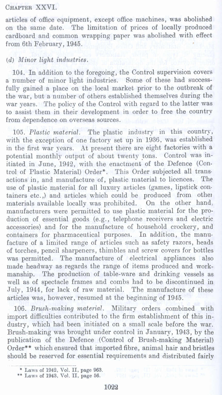 105. Plastic material. The plastic industry in this country, with the exception of one factory set up in 1936, was established in the first war years. At present there are eight factories with a potential monthly output of about twenty _tons. Control was initiated in June, 1942, with the enactment of the Defence (Control of Plastic Material) Order". This Order subjected all transactions in, and manufacture of, plastic material to licences. The use of plastic material for all luxury articles (games, lipstick containers etc.,) and articles which could be produced from other materials available locally was prohibited. On the other hand. manufacturers were permitted to use plastic material for the production of essential goods (e.g., telephone receivers and electric accessories) and for the manufacture of household crockery, and containers for pharmaceutical purposes. In addition, the manufacture of a limited range of articles such as safety razors, heads of torches, pencil sharpeners, thimbles and screw covers for bottles was permitted. The manufacture of electrical appliances also made headway as regards the range of items produced and workmanship. The production of table-ware and drinking vessels as well as of spectacle frames and combs had to be discontinued in July, 1944, for lack of raw material. The manufacture of these articles was, however, resumed at the beginning of 1945.