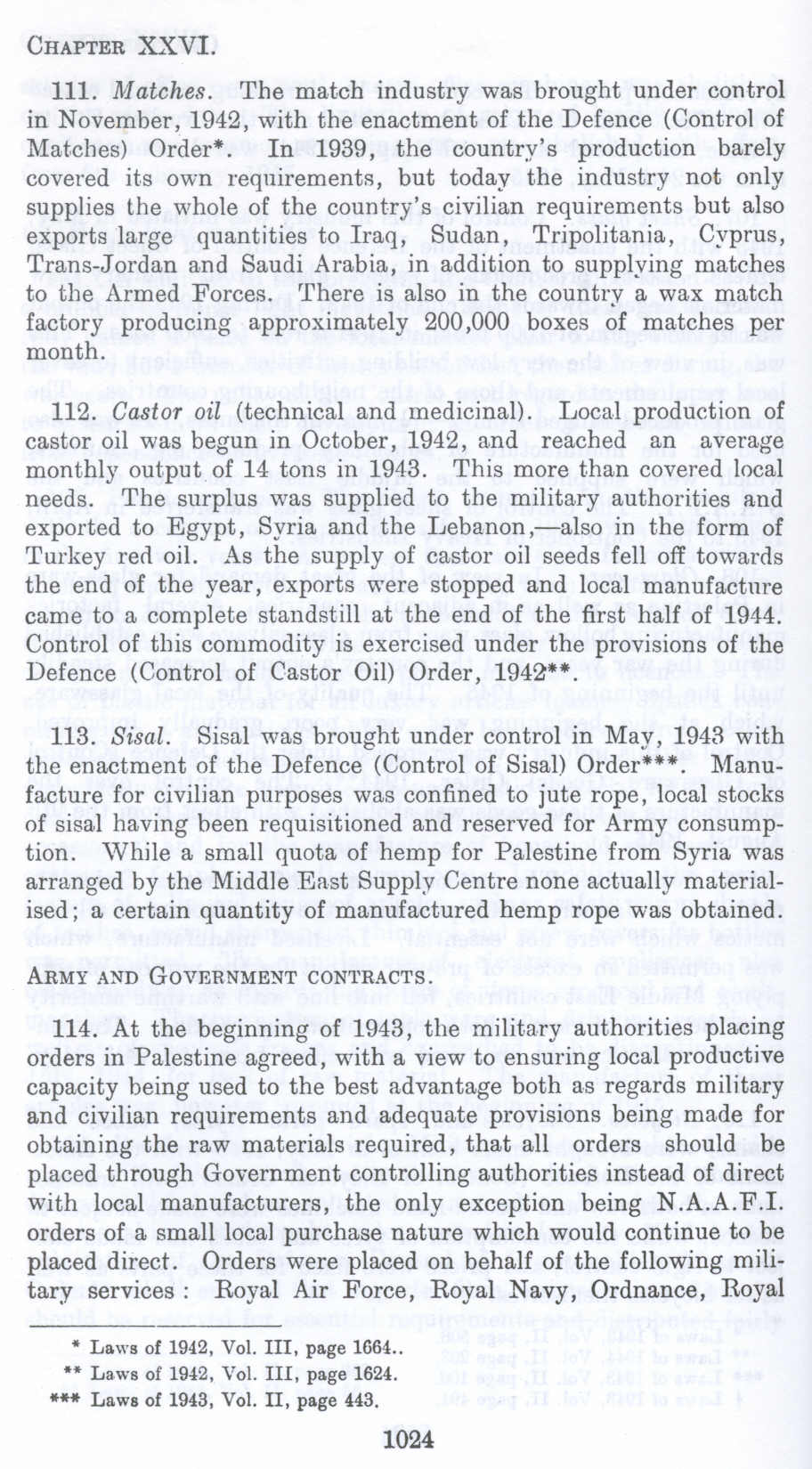 111. Matches. The match industry was brought under control in November, 1942, with the enactment of the Defence (Control of Matches) Order*. In 1939, the country's production barely covered its own requirements, but today the industry not only supplies the whole of the country's civilian requirements but also exports large quantities to Iraq, Sudan, Tripolitania, Cyprus, Trans-Jordan and Saudi Arabia, in addition to supplying matches to the Armed Forces. There is also in the country a wax match factory producing approximately 200,000 boxes of matches per month.