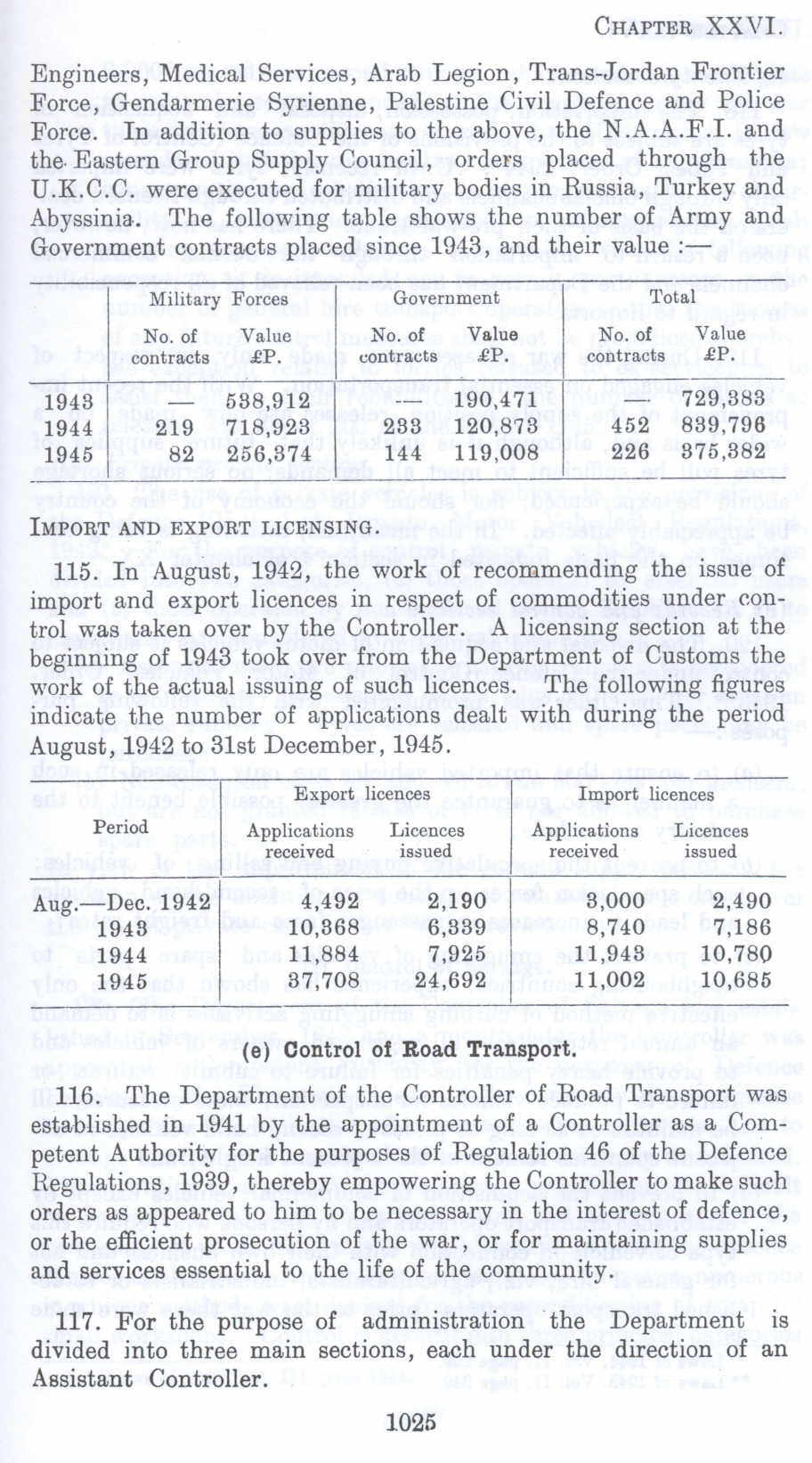 Engineers, Medical Services, Arab Legion, Trans-Jordan Frontier Force, Gendarmerie Syrienne, Palestine Civil Defence and Police Force. In addition to supplies to the above, the N.A.A.F.I. and the Eastern Group Supply Council, orders placed through the U.K.C.C. were executed for military bodies in Russia, Turkey and Abyssinia. The following table shows the number of Army and Government contracts placed since 1943, and their value :-