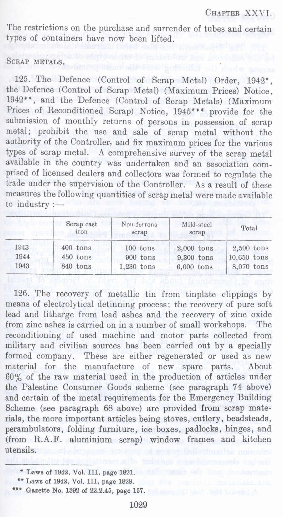 125. The Defence (Control of Scrap Metal) Order, 1942., the Defence (Control of Scrap Metal) (Maximum Prices) Notice, 1942**, and the Defence (Control of Scrap Metals) (Maximum Prices of Reconditioned Scrap) Notice, 1945*** provide for the submission of monthly returns of persons in possession of scrap metal; prohibit the use and sale of scrap metal without the authority of the Controller, and fix maximum prices for the various types of scrap metal. A comprehensive survey of the scrap metal available in the country was undertaken and an association comprised of licensed dealers and collectors was formed to regulate the trade under the supervision of the Controller. As a result of these measures the following quantities of scrap metal were made available to industry :-