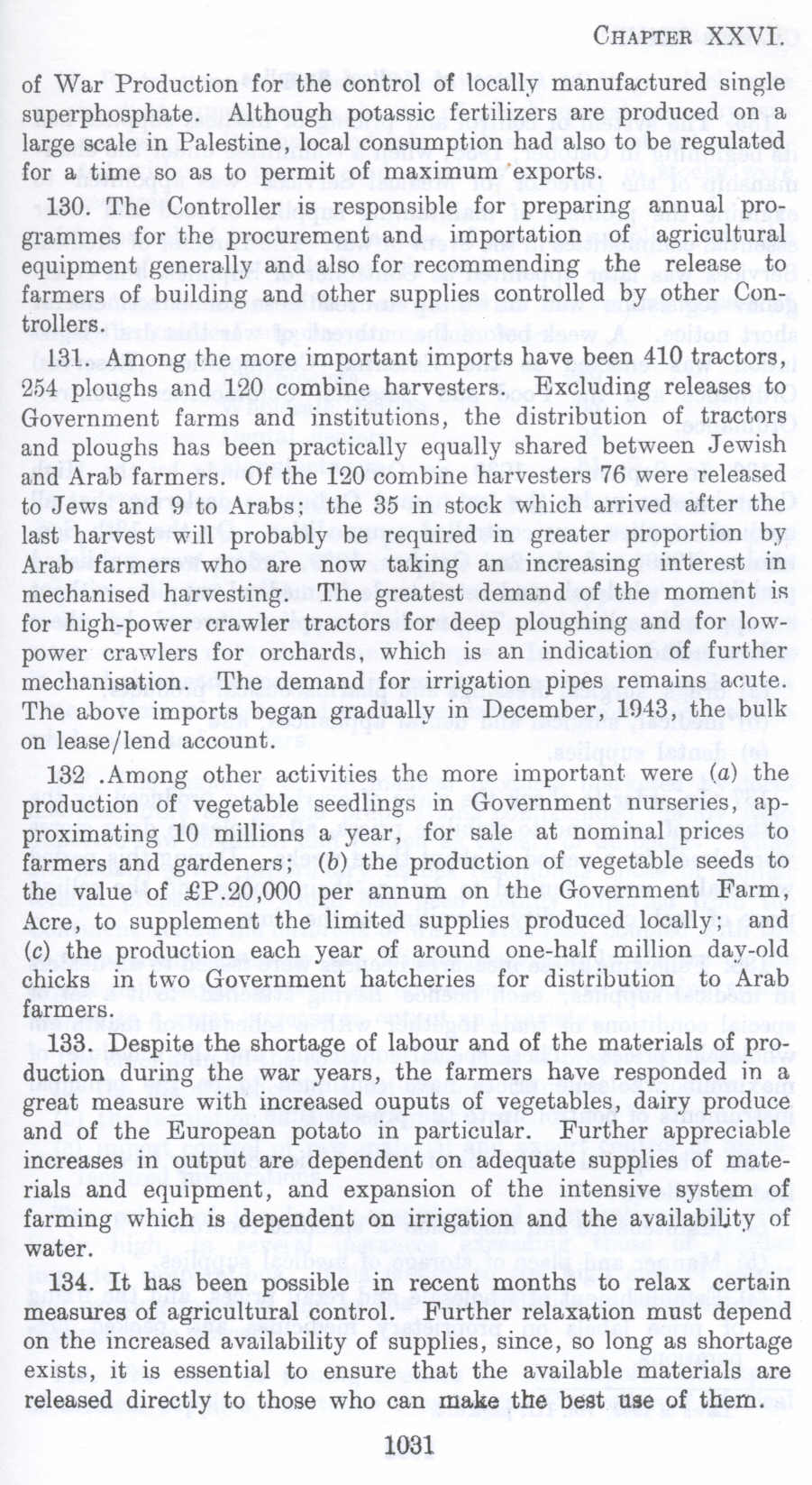 131. Among the more important imports have been 410 tractors, 254 ploughs and 120 combine harvesters. Excluding releases to Government farms and institutions, the distribution of tractors and ploughs has been practically equally shared between Jewish and Arab farmers. Of the 120 combine harvesters 76 were released to Jews and 9 to Arabs: the 35 in stock which arrived after the last harvest will probably be required in greater proportion by Arab farmers who are now taking an increasing interest in mechanized harvesting. The greatest demand of the moment is for high-power crawler tractors for deep ploughing and for lowpower crawlers for orchards, which is an indication of further mechanisation. The demand for irrigation pipes remains acute. The above imports began gradually in December, l!l43, the bulk on lease/lend account.