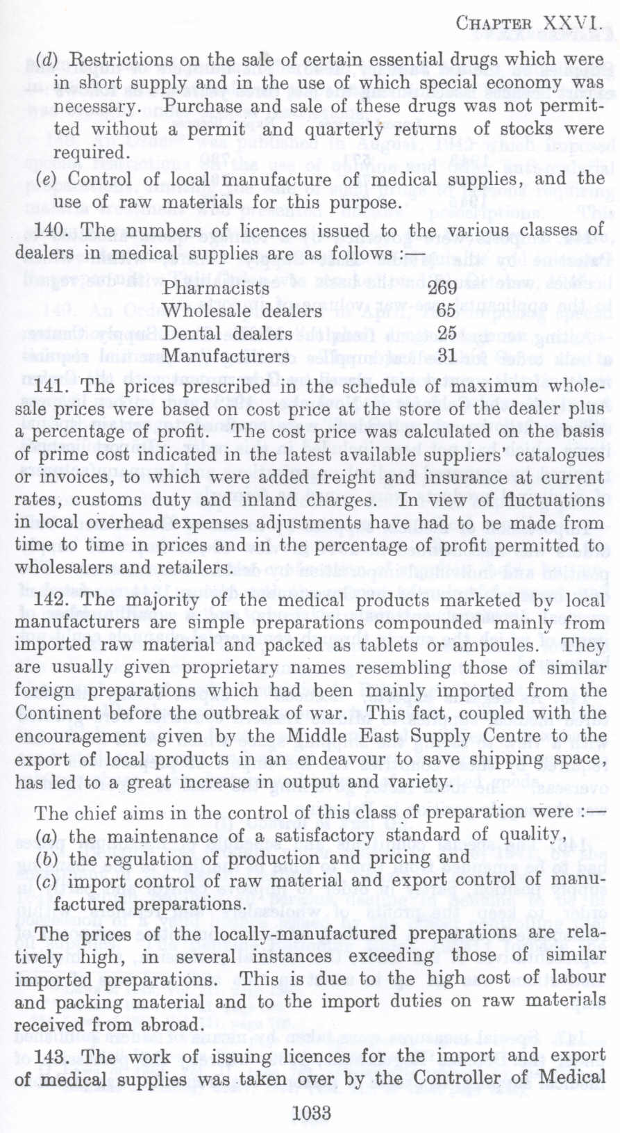 143. The work of issuing licences for the import and export of medical supplies was taken over by the Controller of Medical