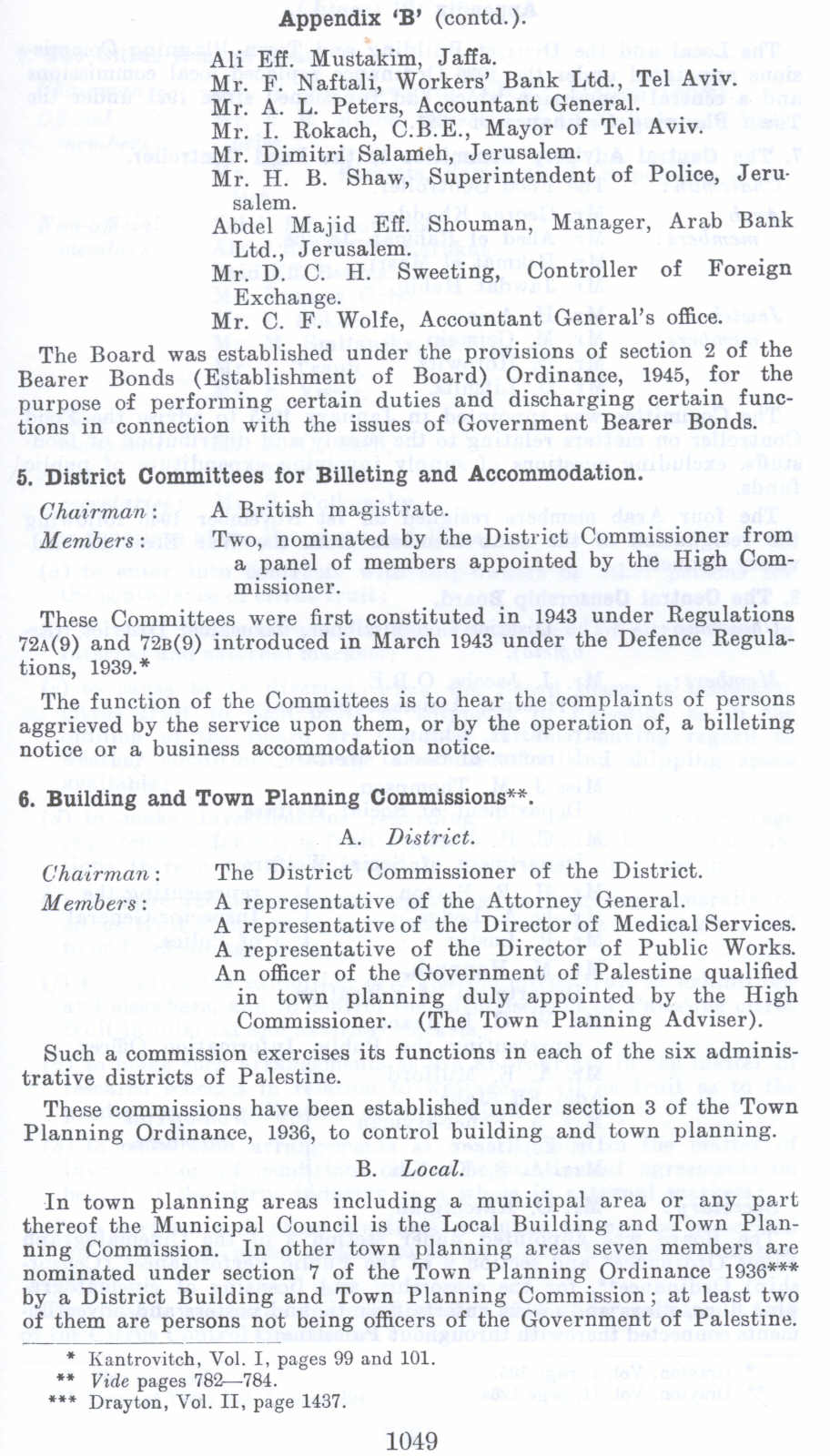 In town planning areas including a municipal area or any part thereof the Municipal Council is the Local Building and Town Planning Commission. In other town planning areas seven members are nominated under section 7 of the Town Planning Ordinance 1936*** by a District Building and Town Planning Commission; at least two of them are persons not being officers of the Government of Palestine.