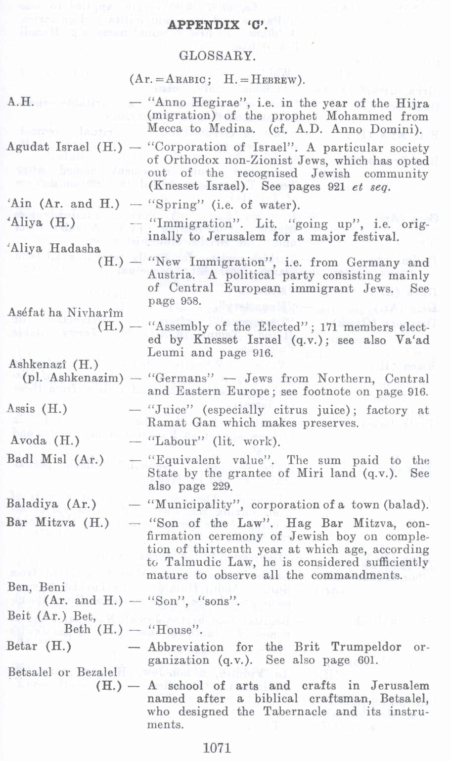 Glossary of commonly used Hebrew and Arabic terms. British Mandate: A Survey of Palestine: Volume II - Page 1071. Appendix C: |