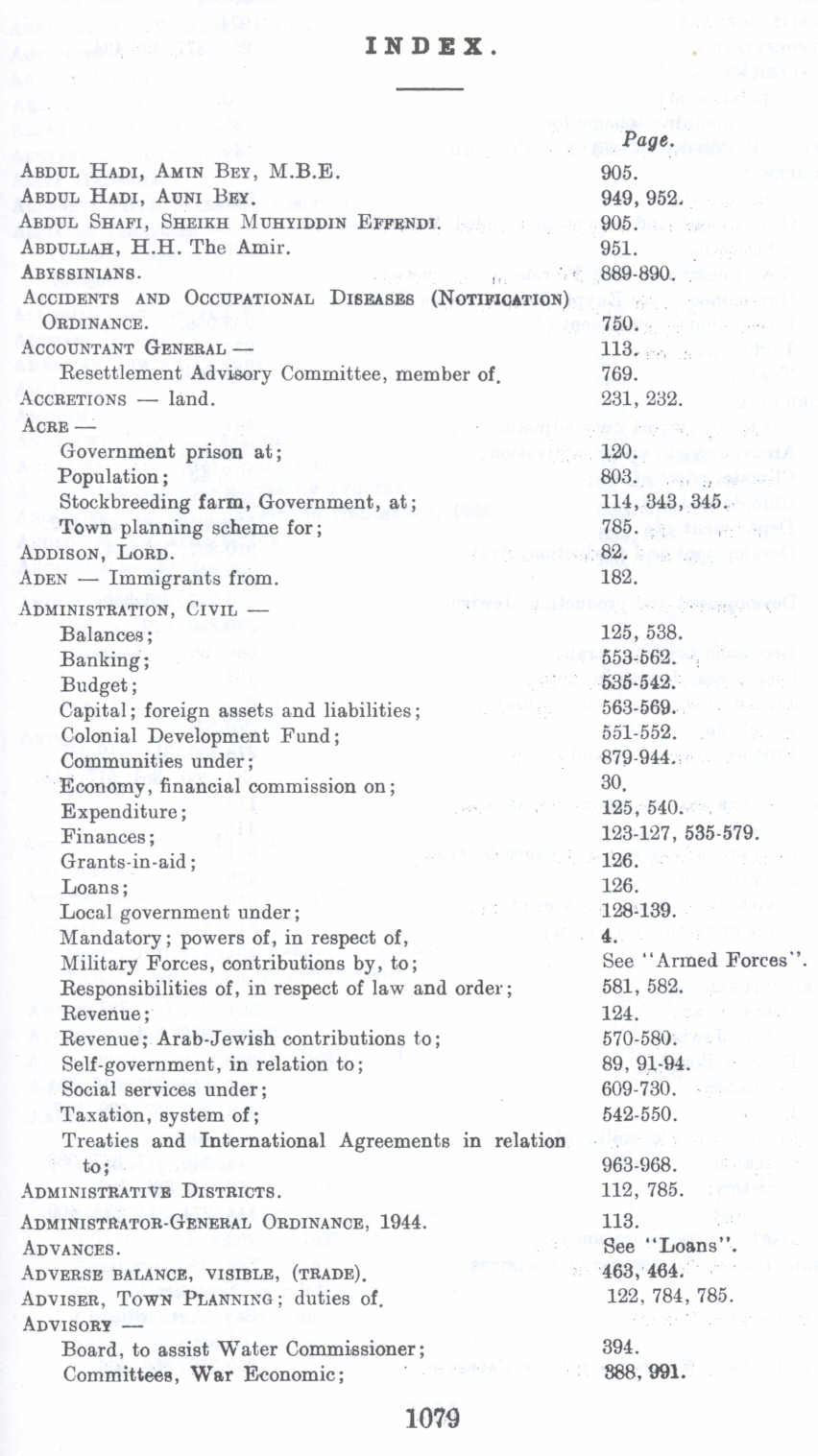 Index : British Mandate: A Survey of Palestine: Volume II - Page 1079. |