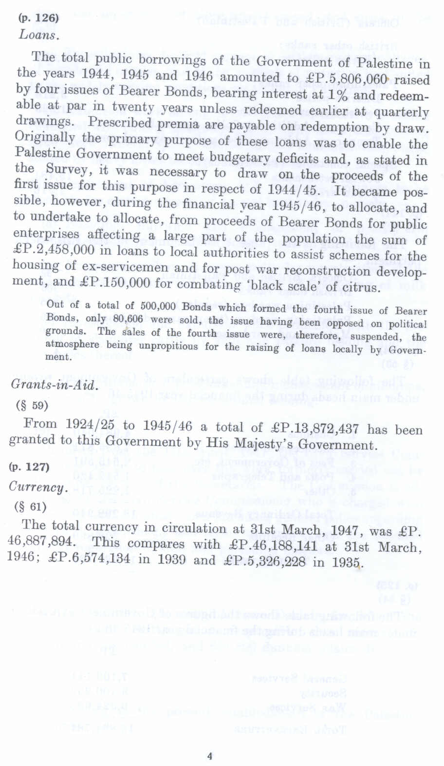 The total public borrowings of the Government of Palestine in the years 1944, 1915 and 1946 amounted to .£P.5,806,06(} raised by four issues of Bearer Bonds, bearing interest at 1 % and redeemable at par in twenty years unless redeemed earlier at quarterly drawings. Prescribed premia are payable on redemption by draw. Originally the primary purpose of these loans was to enable the Palestine Government to meet budgetary deficits and, as stated in the Survey, it was necessary to draw on the proceeds of the first issue for this purpose in respect of 1944/45. It became possible, however, during the financial year 19~ 5 / 46, to allocate, and to undertake to allocate, from proceeds of Bearer Bonds for public enterprises affecting a large part of the population the sum of £P.2,458,000 in loans to local authorities to assist schemes for the housing of ex-servicemen and for post war reconstruction development, and £P.150,000 for combating 'black scale' of citrus.