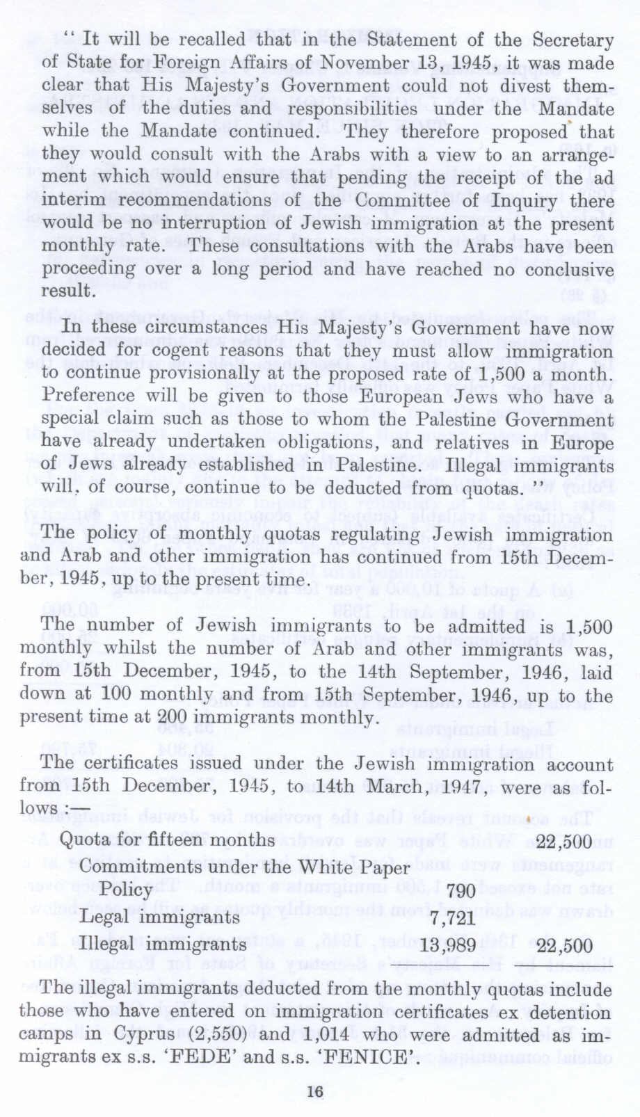 The policy of monthly quotas regulating Jewish immigration and Arab and other immigration has continued from 15th December, 1945, up to the present time.