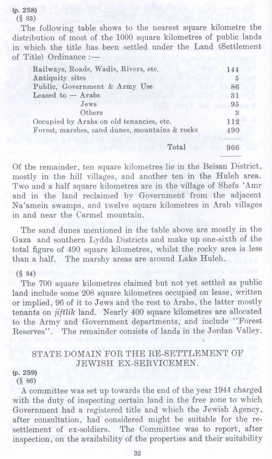 The 700 square kilometres claimed but not yet settled as public land include some 208 square kilometres occupied on lease, written or implied, 96 of it to Jews and the rest to Arabs, the latter mostly tenants on iiftlik land. Nearly 400 square kilometres are allocated to the Army and Government departments, and include "Forest Reserves". The remainder consists of lands in the Jordan Valley.