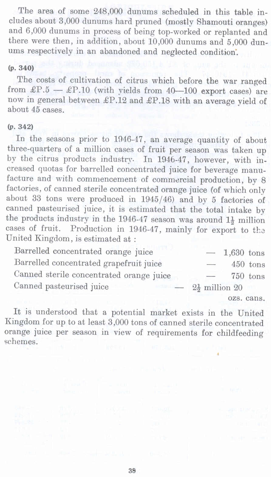 The costs of cultivation of citrus which before the war ranged from £P.5 - £P.10 (with yields from 40-100 export cases) are now in general between £P .12 and £P .18 with an average yield of about 45 cases.