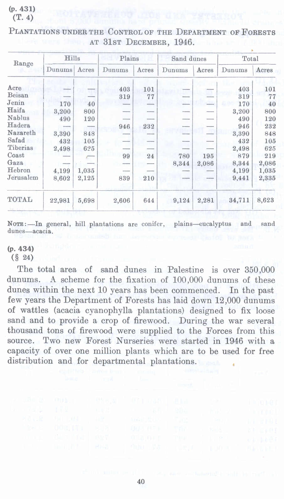 The total area of sand dunes in Palestine is over 350,000 dunums. A scheme for the fixation of 100 ,000 dunums of these dunes within the next 10 years has been commenced. In the past few years the Department of Forests has laid down 12,000 dunums of wattles (acacia cyanophylla plantations) designed to fix loose sand and to provide a crop of firewood. During the war several thousand tons of firewood were supplied to the Forces from this source. Two new Forest Nurseries were started in 1946 with a capacity of over one million plants which are to be used for free distribution and for departmental plantations.