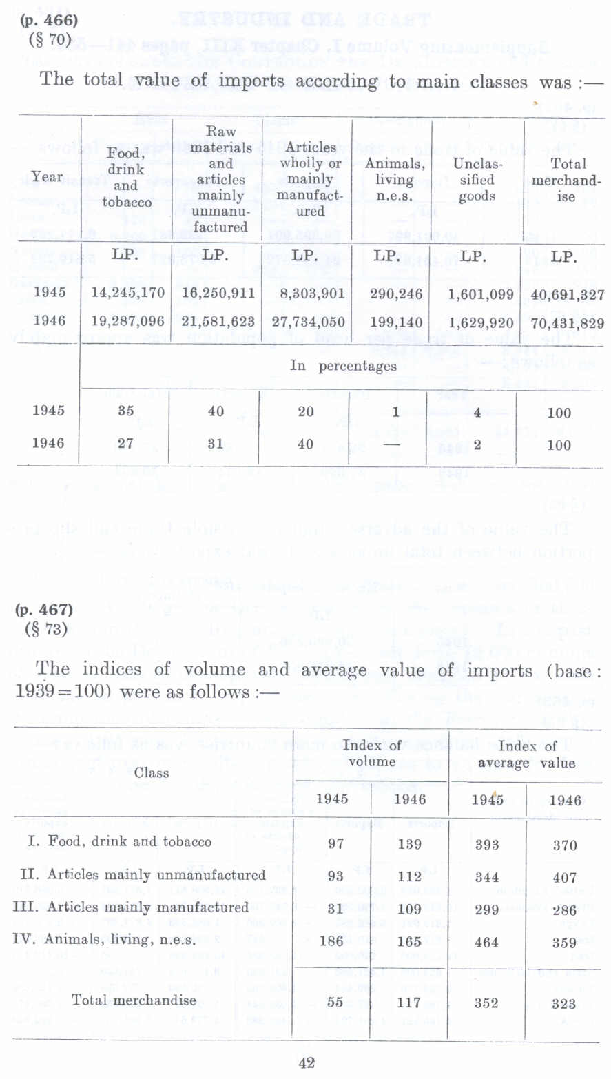 The indices of volume and average value of imports (base: 1939=100) were as follows :-