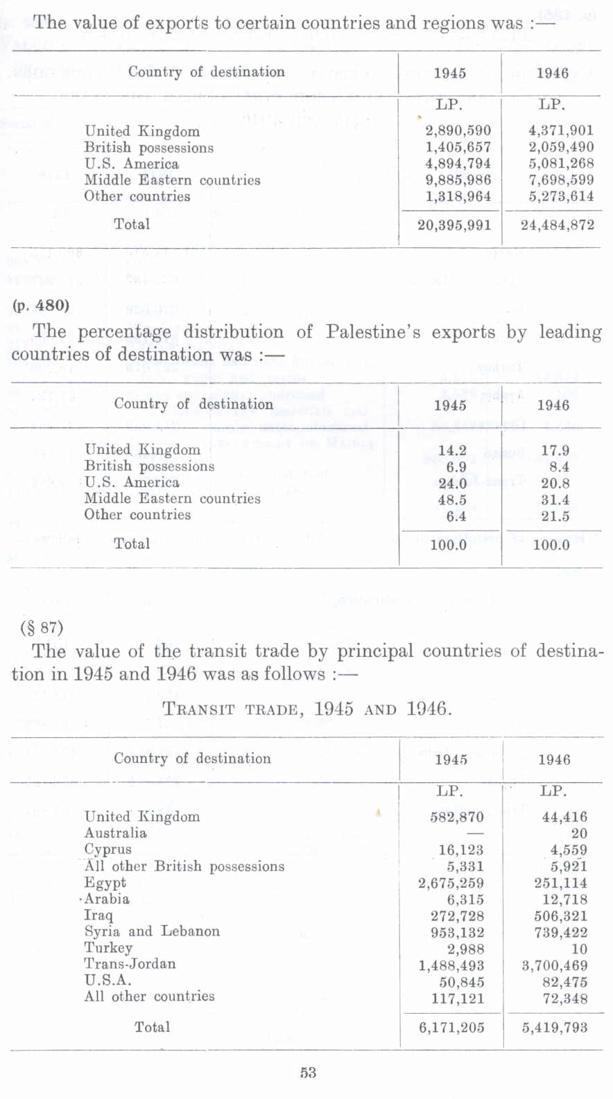 The value of the transit trade by principal countries of destination in 1945 and 1946 was as follows :-