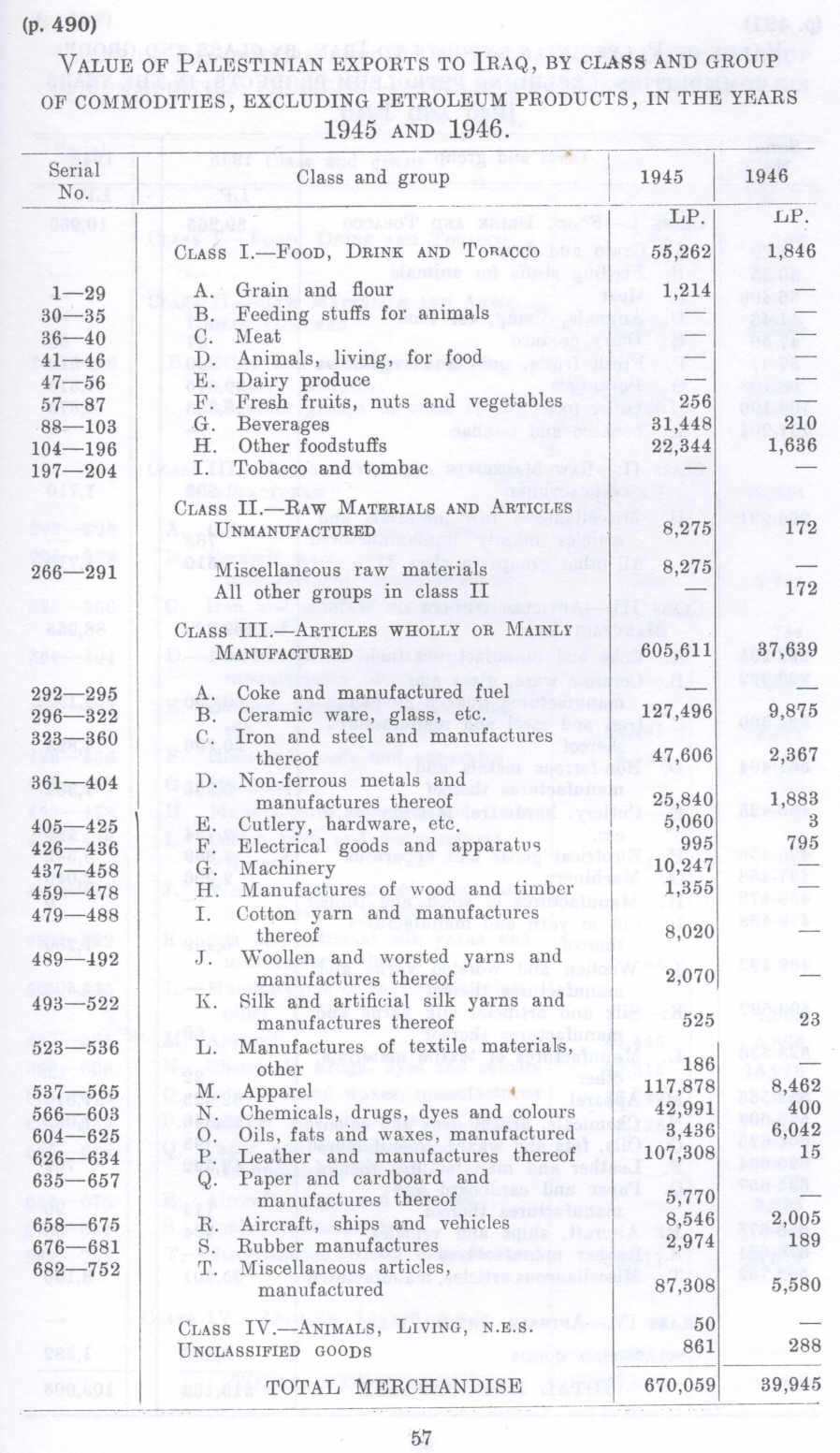 VALUE OF PALESTINIAN EXPORTS TO IRAQ, BY CLASS AND GROUP OF COMMODITIES, EXCLUDING PETROLEUM PRODUCTS, IN THE YEARS 1945 AND 1946.