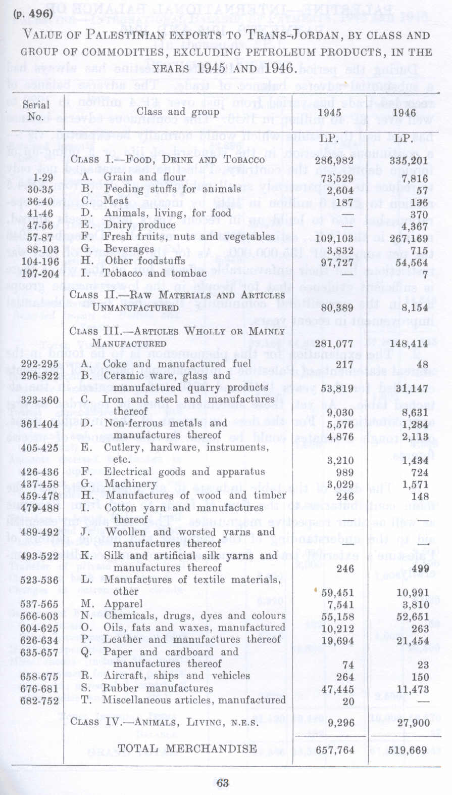 VALUE OF Palestinian EXPORTS TO TRANS-JORDAN BY CLASS AND GROUP OF COMMODITIES, EXCLUDING PETROLEUM PRODUCTS, IN THE YEARS 1945 AND 1946.
