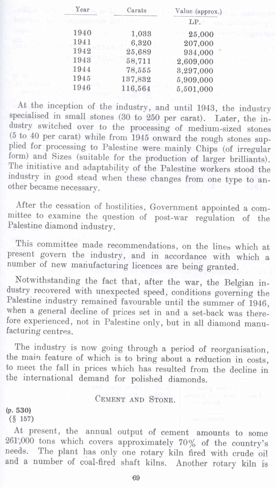 Notwithstanding the fact that, after the war, the Belgian industry recovered with unexpected speed, conditions governing the Palestine industry remained favourable until the summer of 1946, when a general decline of prices set in and a set-back was therefore experienced, not in Palestine only, but in all diamond manufacturing centres.