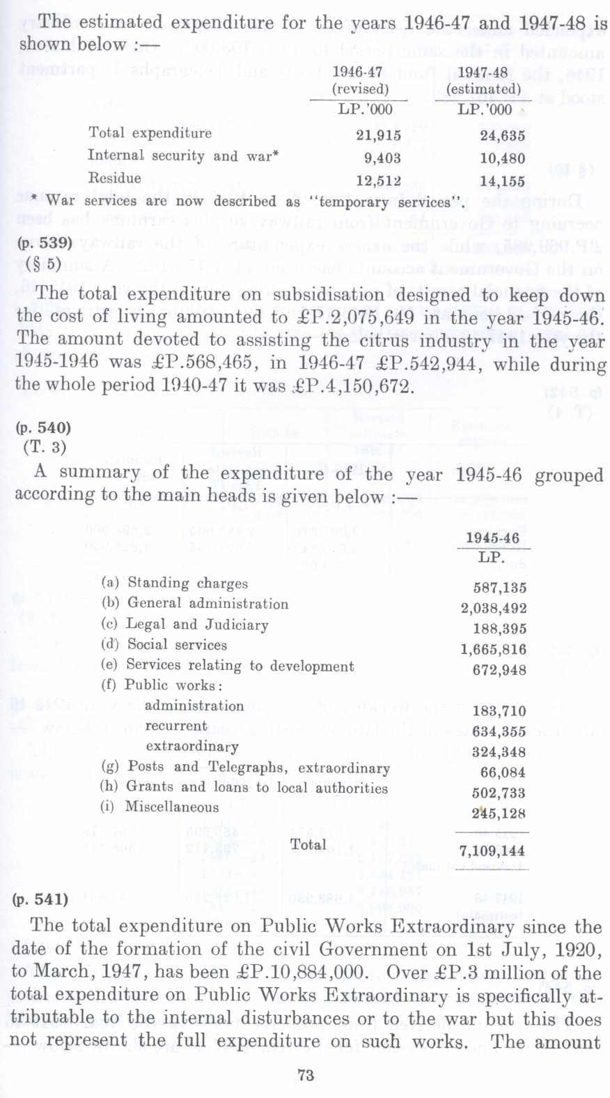 The total expenditure on subsidization designed to keep down the cost of living amounted to £P.2,075,649 in the year 1945-46. The amount devoted to assisting the citrus industry in the year 1945-1946 was £P.568,465, in 1946-47 £P.542,044, while during the whole period lnJ0-47 it was ,£P.4,150,672.