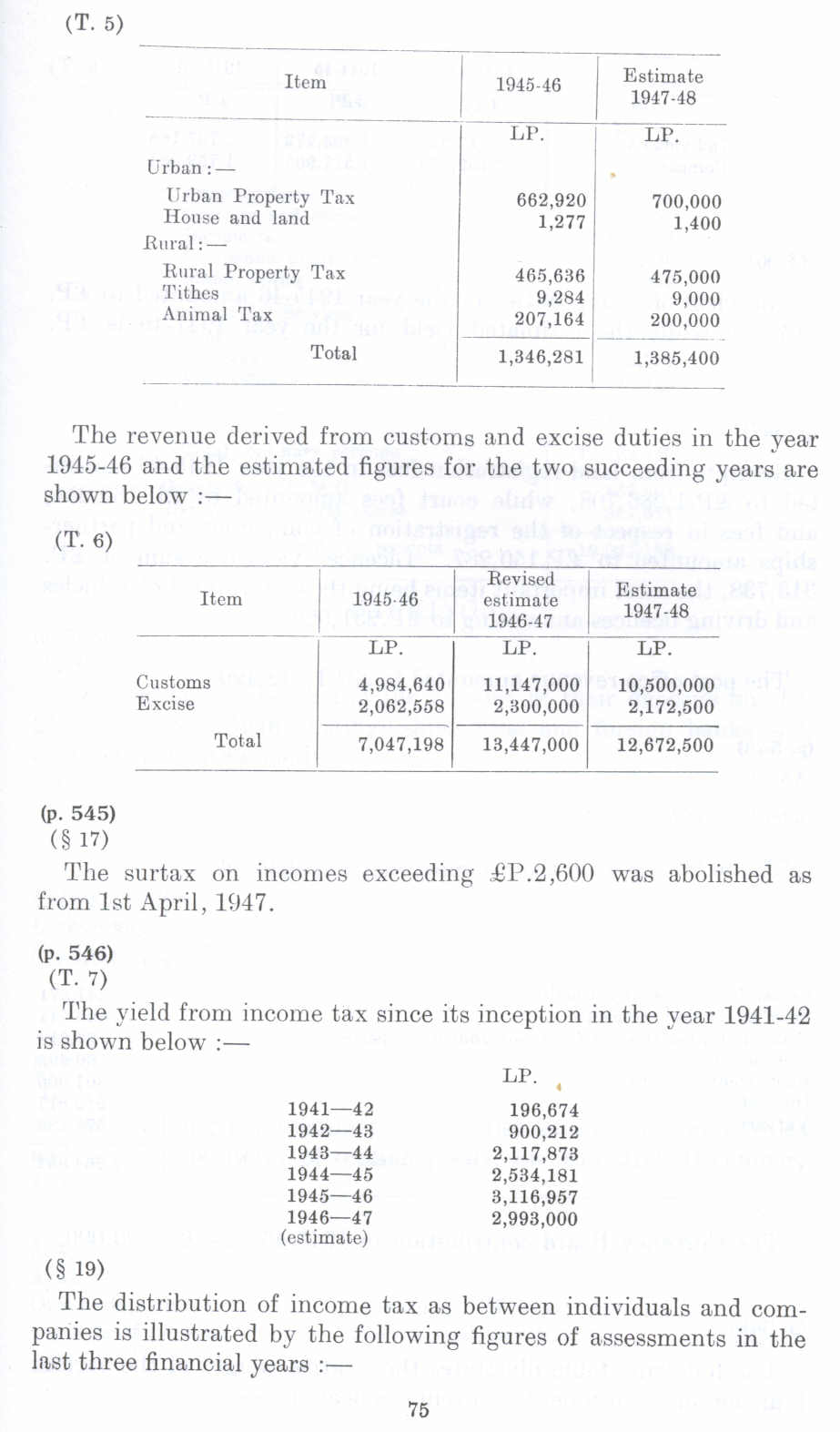 The surtax on incomes exceeding £P.2,600 was abolished as from 1st April, 1947.