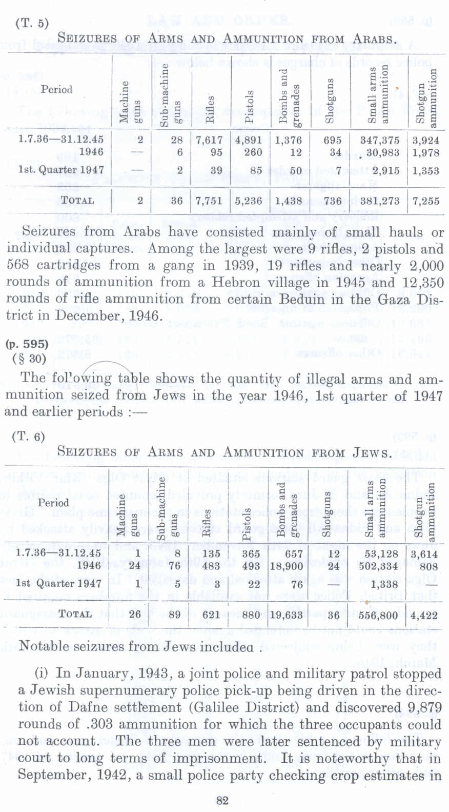 (i) In January, 1943, a joint police and military patrol stopped a Jewish supernumerary police pick-up being driven in the direction of Dafne settlement (Galilee District) and discovered 9 ,879 rounds of .303 ammunition for which the three occupants could not account. The three men were later sentenced by military court to long terms of imprisonment. It is noteworthy that in September, 1942, a small police party checking crop estimates in
