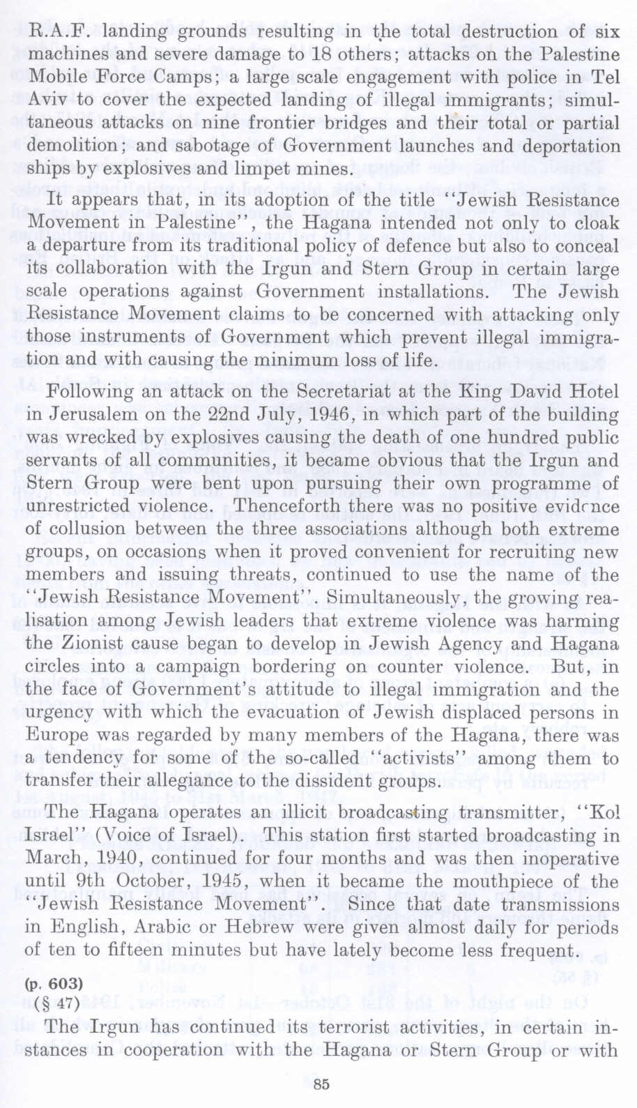 Following an attack on the Secretariat at the King David Hotel in Jerusalem on the 22nd July, 19~6. in which part of the building was wrecked by explosives causing the death of one hundred public servants of all communities, it became obvious that the Irgun and Stern Group were bent upon pursuing their own programme of unrestricted violence. Thenceforth there was no positive evidence of collusion between the three associations although both extreme groups, on occasions when it proved convenient for recruiting new members and issuing threats, continued to use the name of the "Jewish Resistance Movement". Simultaneously, the growing realisation among Jewish leaders that extreme violence was harming the Zionist cause began to develop in Jewish Agency and Hagana circles into a campaign bordering on counter violence. But, in the face of Government's attitude to illegal immigration and the urgency with which the evacuation of Jewish displaced persons in Europe was regarded by many members of the Hagana, there was a tendency for some of the so-called "activists" among them to transfer their allegiance to the dissident groups.